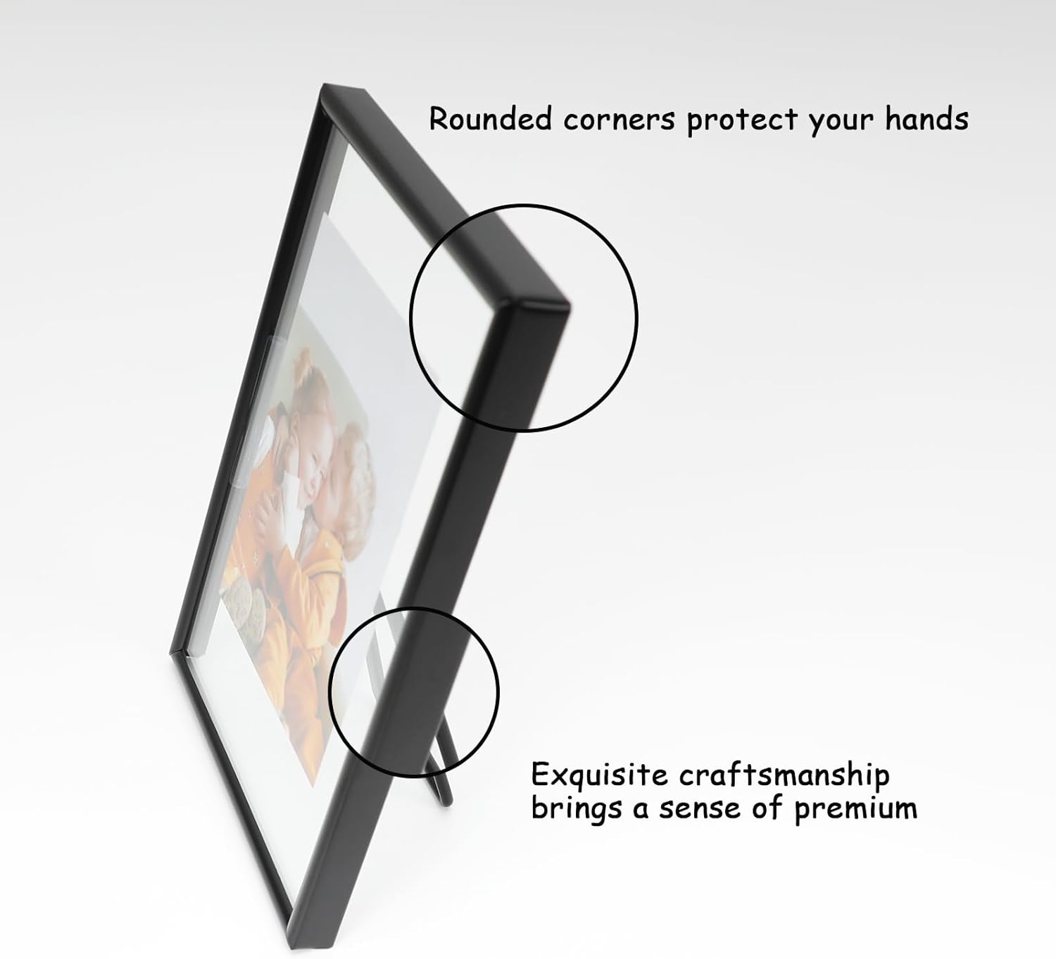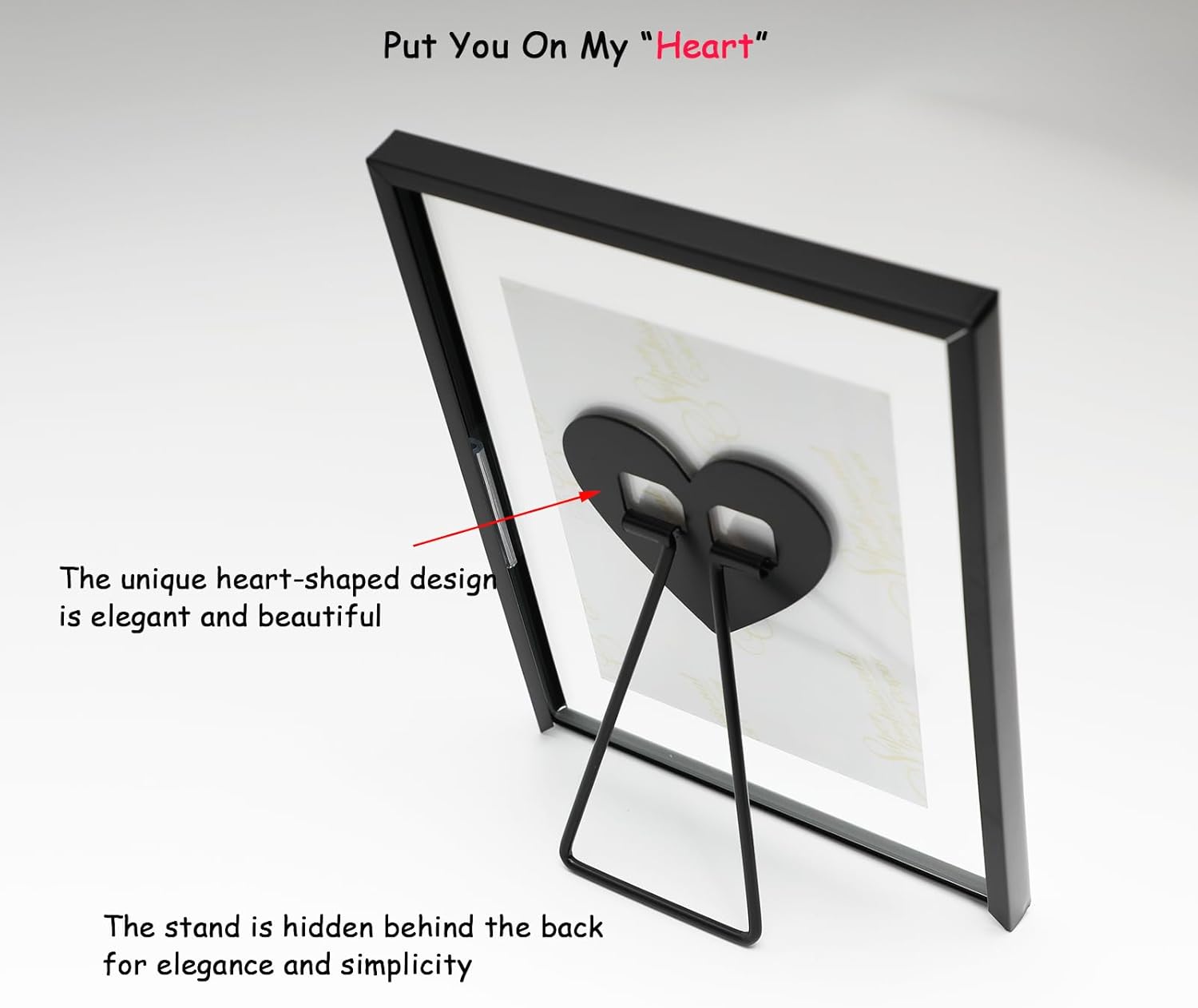 - 【Romantic Design】A black metal frame with heart-shaped stand(Put you in my heart) and transparent glass, making it looks very romantic and elegant. It appears that the photo has a floating effect on it, So you can focus on the photo.