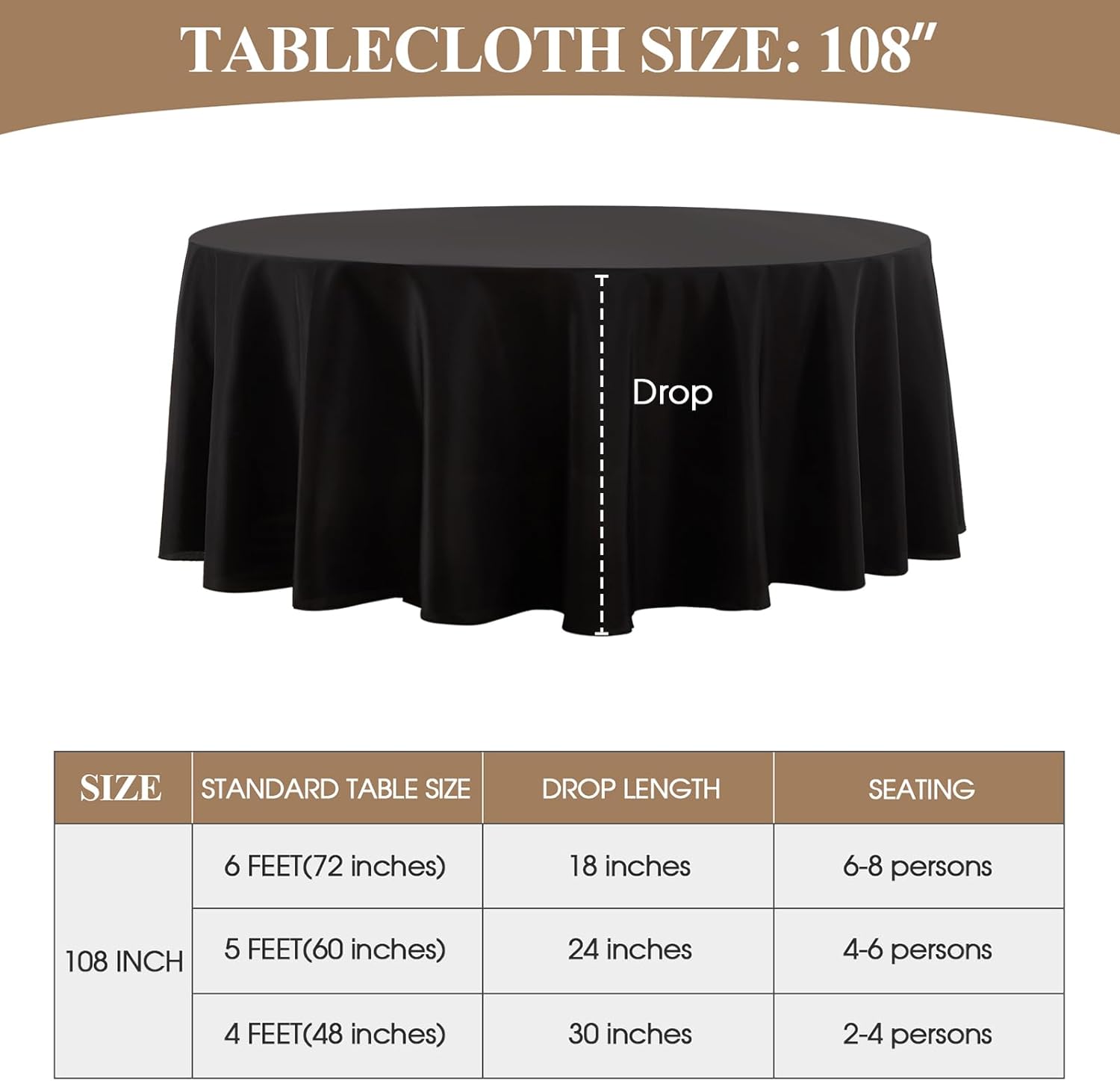 - Suitable Size: This polyester round tablecloth has multiple sizes to choose from, 90, 108, 120, 132 inches, which can meet the needs of tables of different sizes. In order to buy a tablecloth that is more suitable for your table, please measure the actual size of your table before purchasing and refer to our size chart