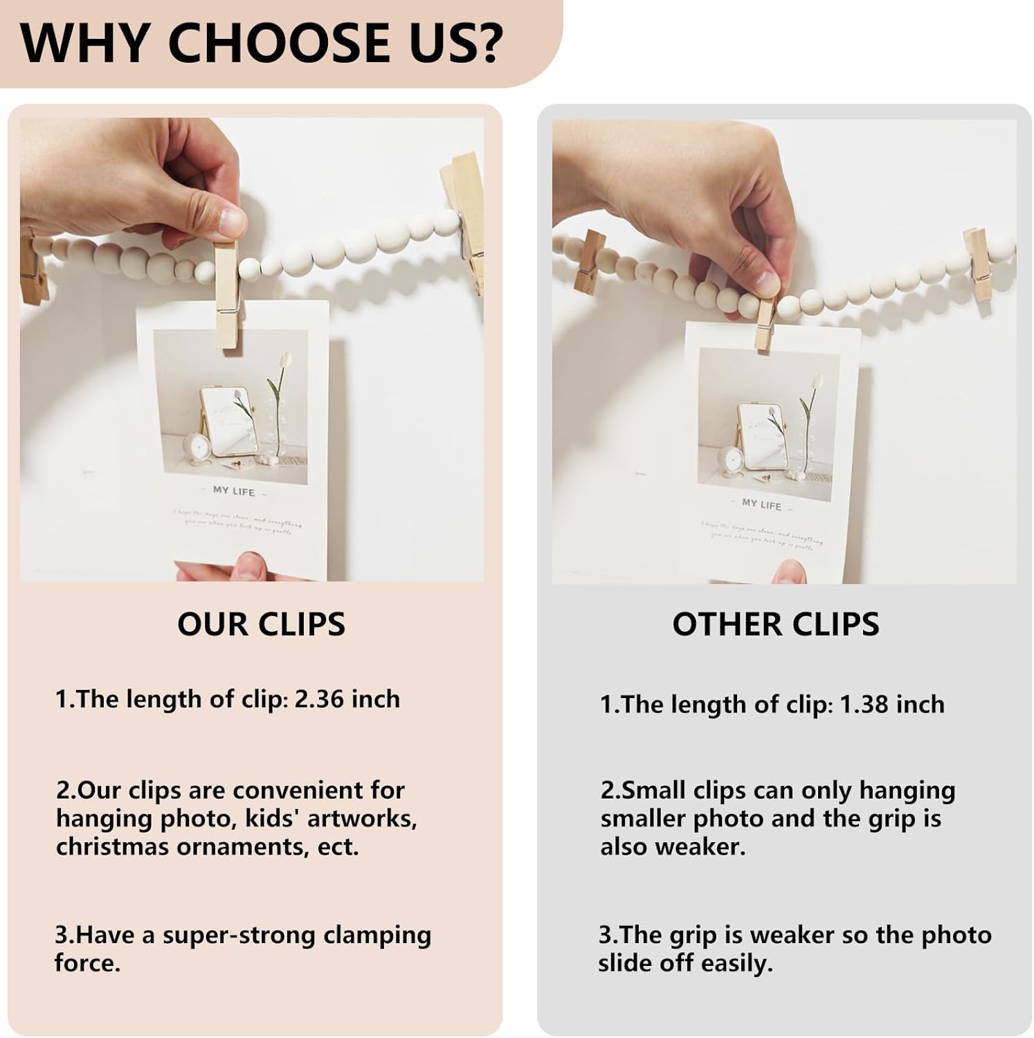 - Multi Photo Hanging: Wall decor photo holder with 9pcs large wooden clips, you can give your custom wall art a makeover any time you want by simply removing or adding photos. Unique large clips design can also be used to hang christmas ornaments, home decorations, holiday items ect