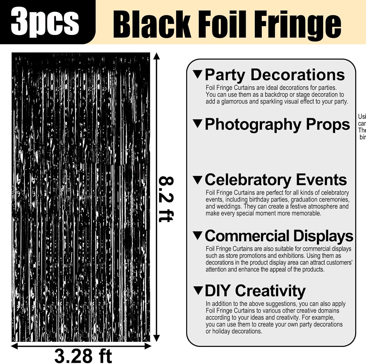 3 Pack Black Foil Fringe Curtain Backdrop, 3.28Ft x 8.2Ft Metallic Tinsel Foil Fringe Streamer Curtains for Photo Booth, Christmas Day, Thanksgiving, Wedding, New Year Party Decorations