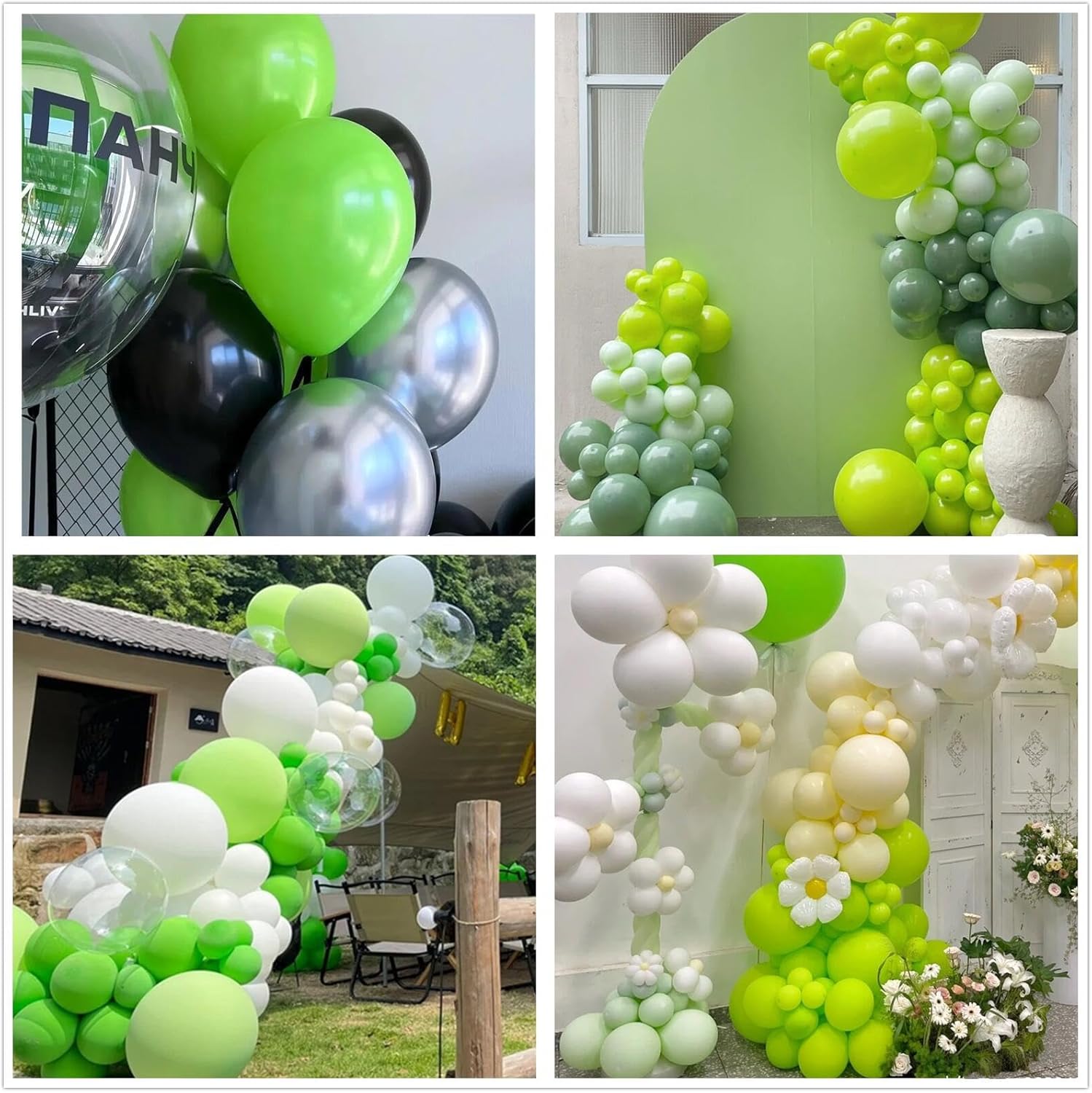 - Lime Green BALLOON ARCH GARLAND KIT: Includes 412 Lime green Balloons, 18inch 12pcs, 12inch 100pcs, 10inch 100pcs, 5inch 200pcs , 2 rolls of Balloon glue point(200pcs), 2 rolls of balloon decoration strip(32.8 feet / 5m*2 with 220 holes), 2 roll of ribbon. plenty in quantity, perfect for making indoor or outdoor them decoration.