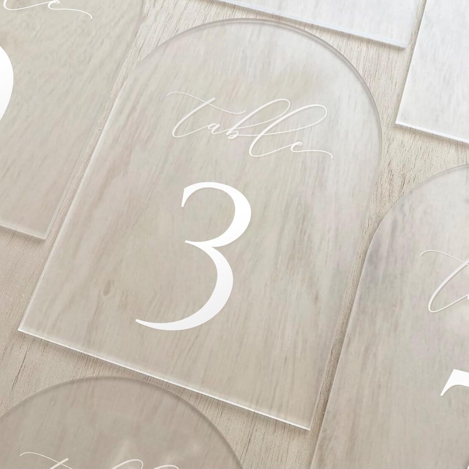 - Frosted Acrylic Arch Table Numbers with Acrylic Stands: Arched acrylic is so on trend for this year's wedding decorations. These gorgeous arch acrylic wedding table numbers will look stunning on your tables and go with any wedding style, from rustic through to timeless and classic.