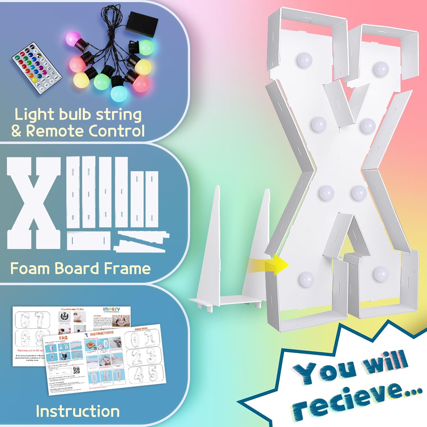 imprsv 3FT Colorful Marquee Light Up Letters X, 18 Colors Light Up Sign Alphabet Sign with Remote, One Letters First Birthday, Large Letters for Birthday Engagement Anniversary Wedding Party Decor