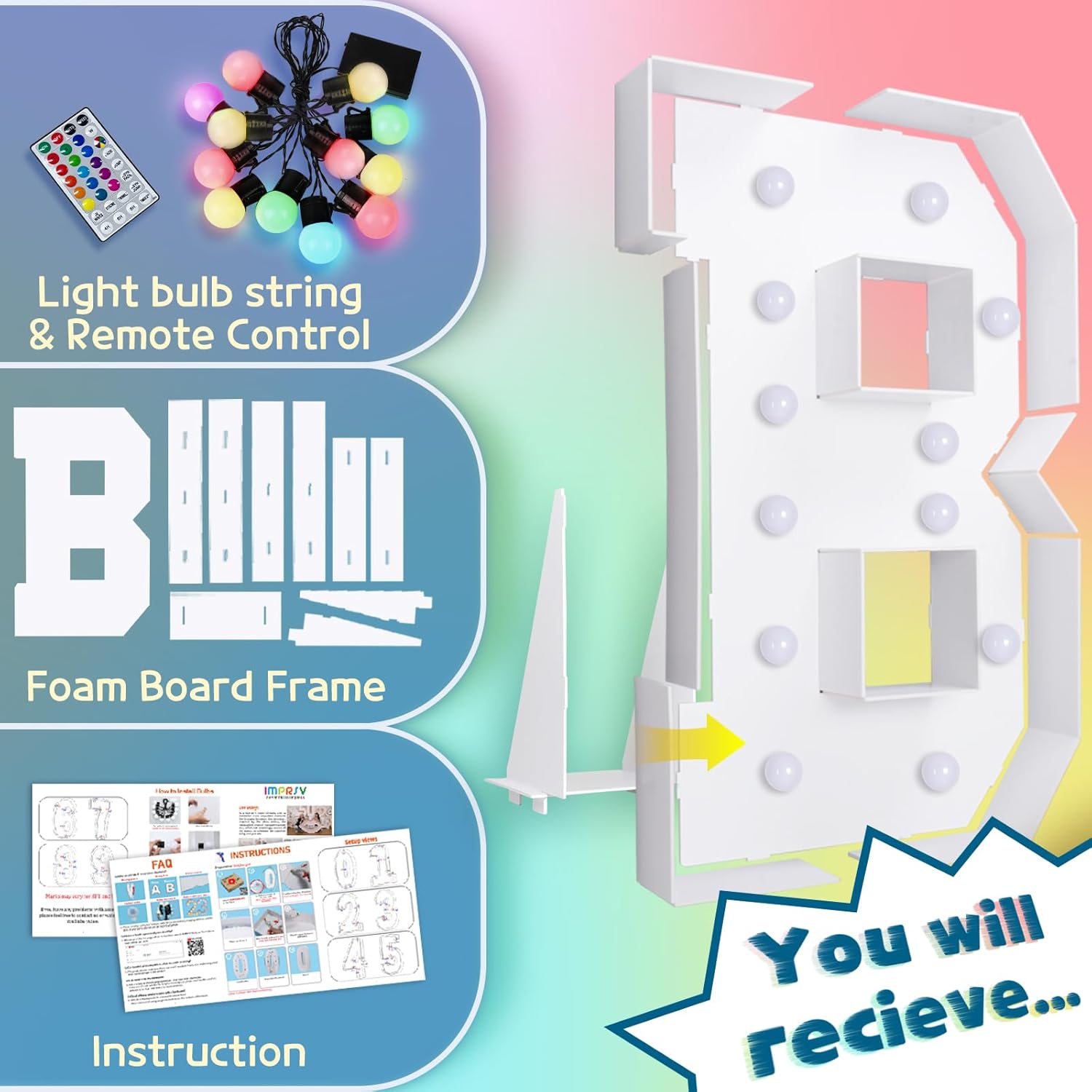 imprsv 4FT Colorful Marquee Light Up Letters B, 18 Colors Large Light up Letters Alphabet Sign with Remote, Large Marry Me Sign, Birthday Party Decorations Baby Shower Anniversary Wedding Decoration