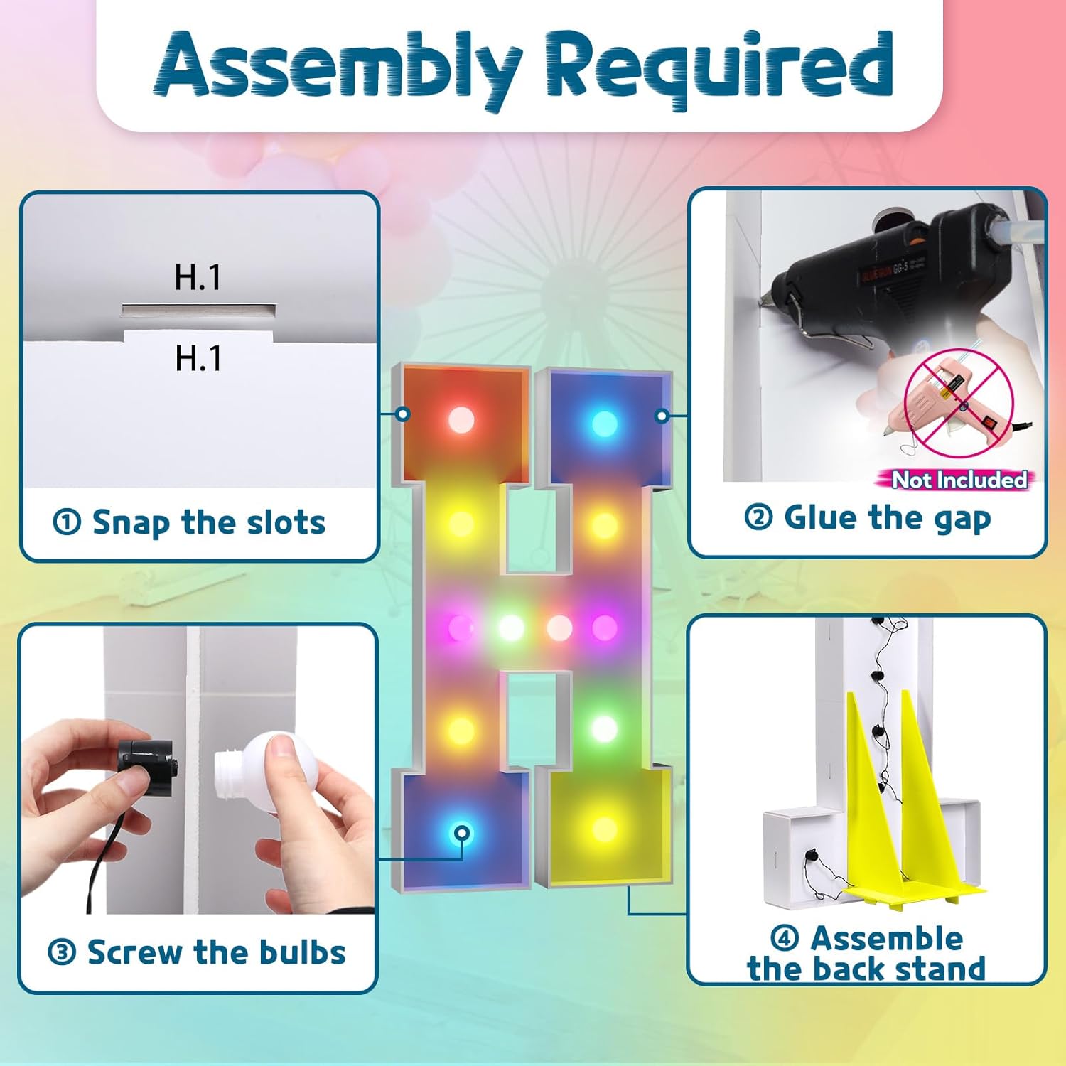 - Assembly Required. To assemble the light up numbers and letters, a hot glue gun is necessary. We have conveniently pre-cut the numbers into several pieces for your convenience. Simply consult the included instruction manual to easily assemble the impressive 4 ft tall and 3ft tall marquee numbers and letters using a hot glue gun.