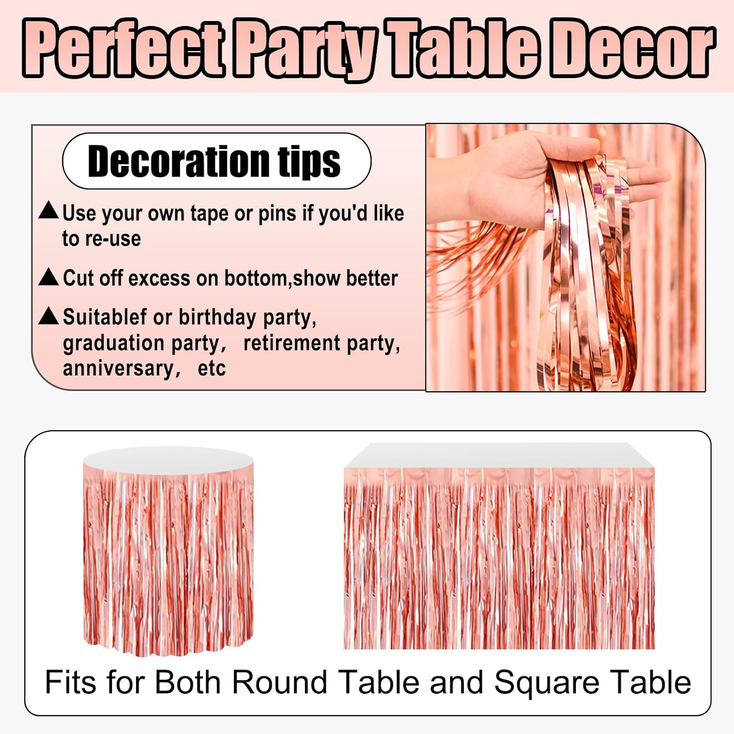 - Specifications and dimensions:3 Packs metallic foil tassel table skirt 29x108 inches, which is enough to decorate your party, provide you with excellent Convenient installation: the table skirt is equipped with self-adhesive tape. Just tear off the tape and paste it. The installation is convenient and quick. It can be pasted on the edge of your round table and square table. It can be easily cut into any siz.