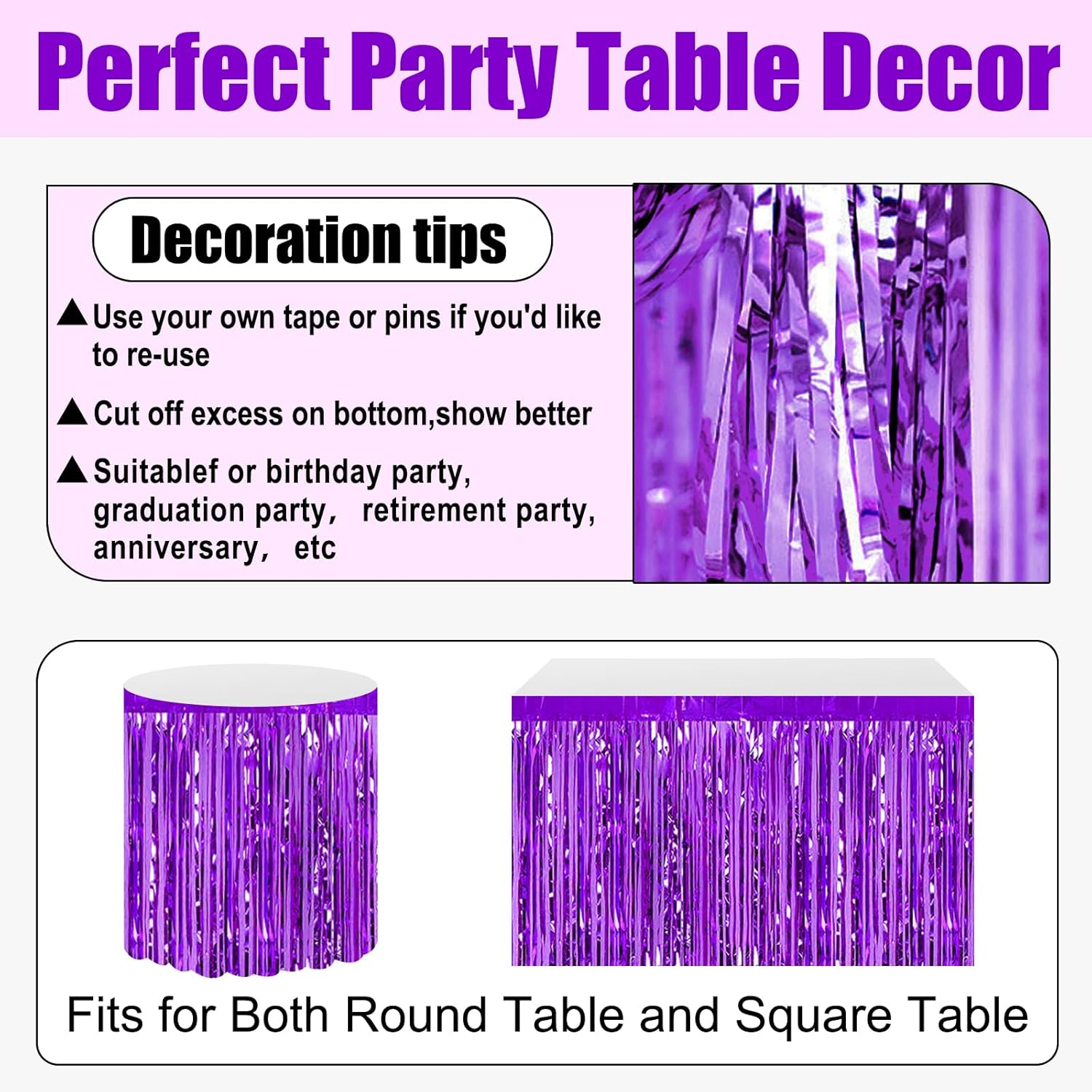 - Specifications and dimensions:3 Packs metallic foil tassel table skirt 29x108 inches, which is enough to decorate your party, provide you with excellent Convenient installation: the table skirt is equipped with self-adhesive tape. Just tear off the tape and paste it. The installation is convenient and quick. It can be pasted on the edge of your round table and square table. It can be easily cut into any siz.