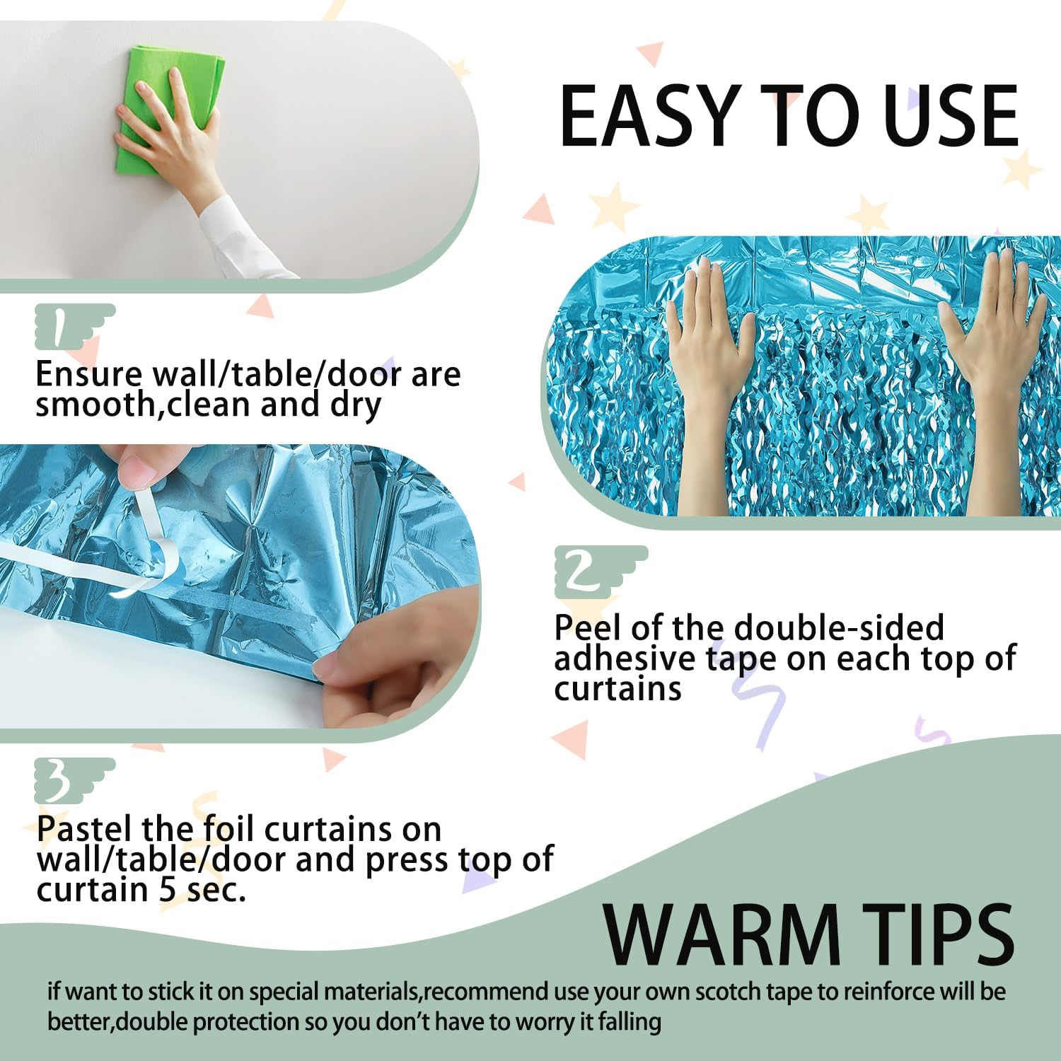 - Package Included: 3 packs blue fringe curtain, the size of 3.3*6.6ft,It's long enough to fit any occasion,Please do not stick the foil curtain on uneven or stained walls to prevent it from falling off!!!