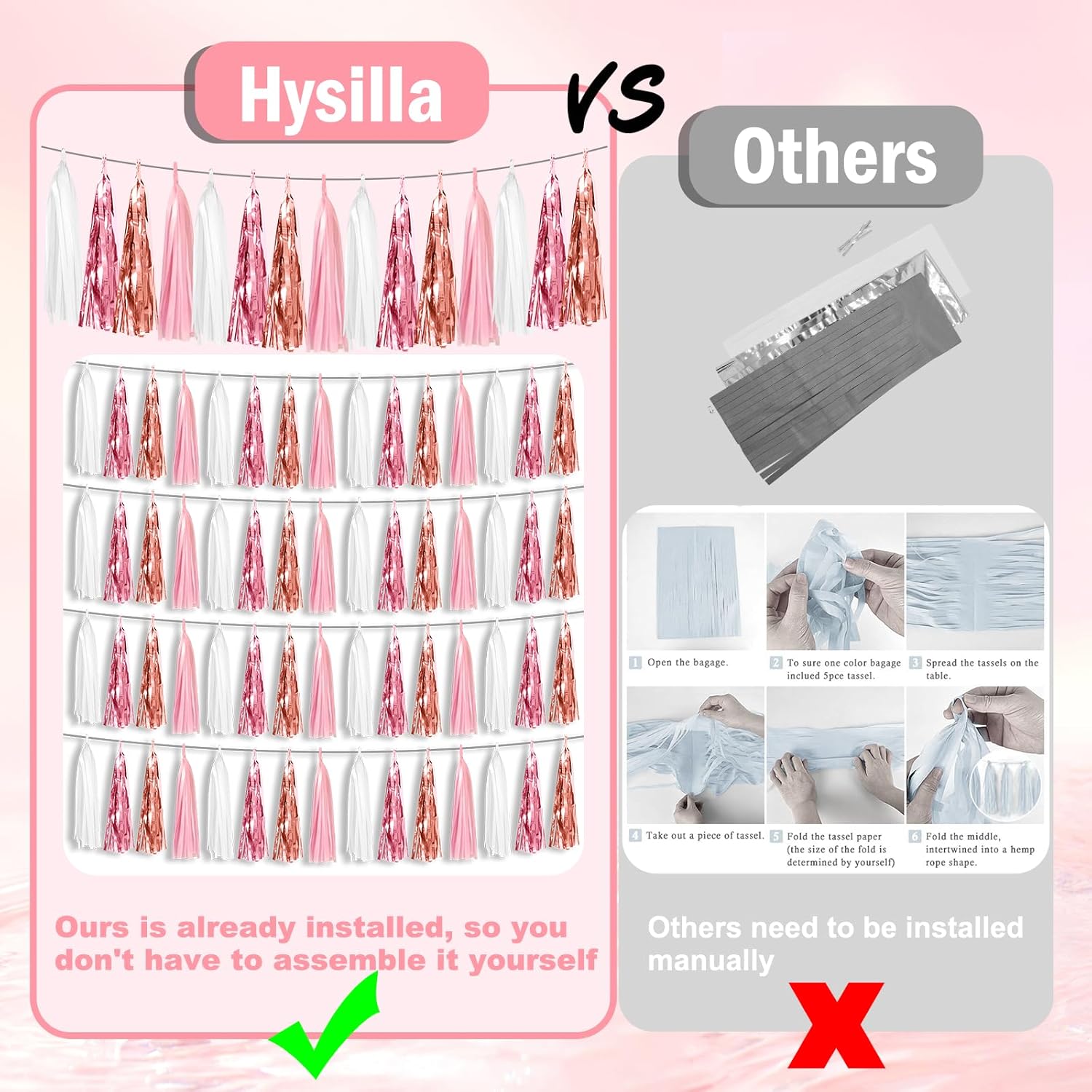- 【Pink White Peach Rose Gold Party Supplies Set】: The total length of the pink white peach rose gold birthday tassels banner is 59 feet, divided into 4 strips, each 9.8 feet long. Each banner contains 15 tassels, and each tassel measures 14 inches, for birthday decorations many occasions, and so on