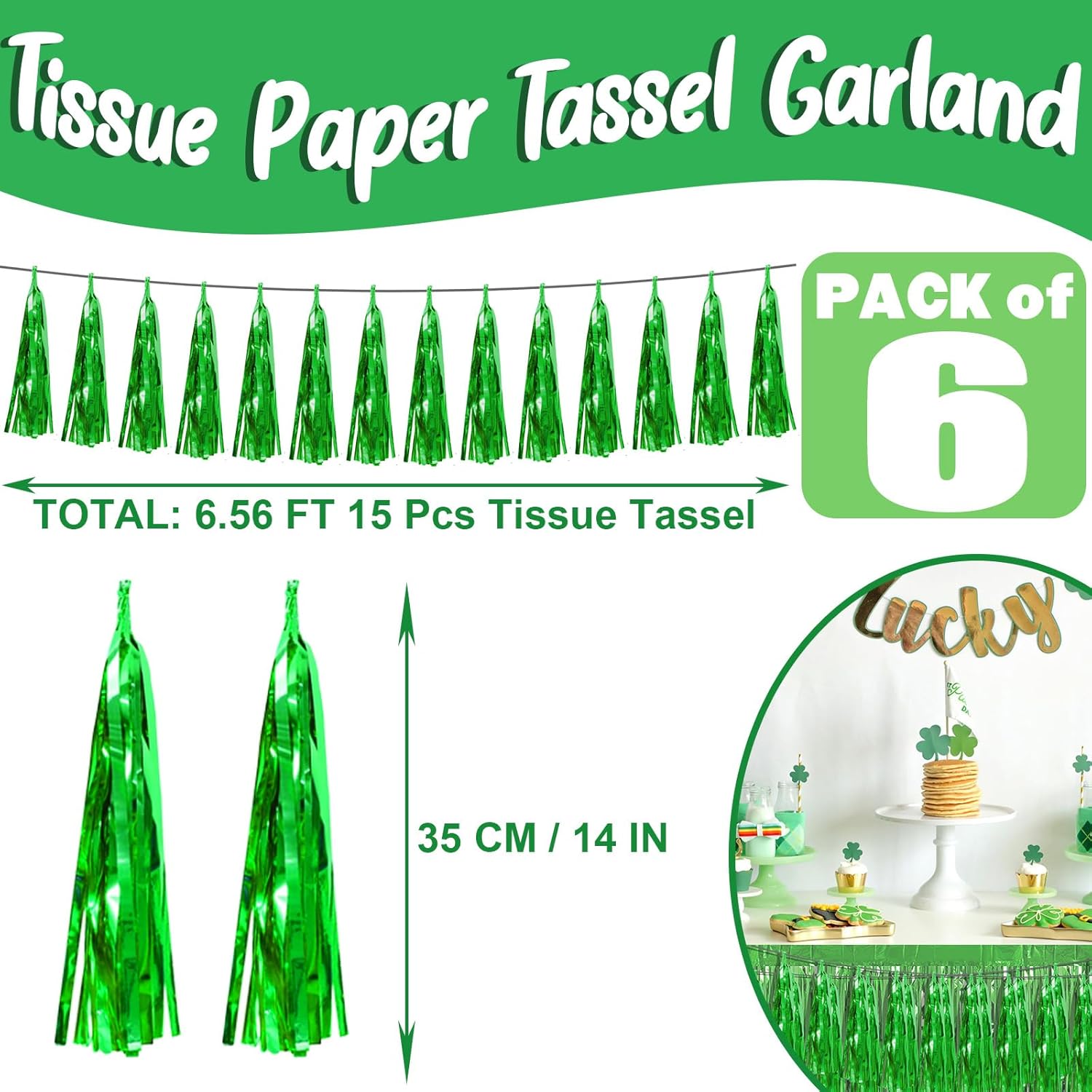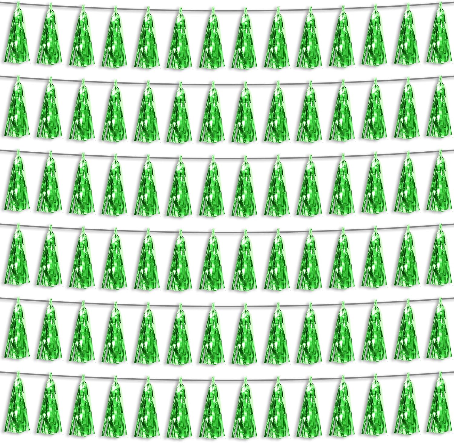 - 【Green Party Supplies Set】: The total length of the green birthday tassels banner is 59 feet, divided into 6 strips, each 9.8 feet long. Each banner contains 15 tassels, and each tassel measures 14 inches, for birthday decorations many occasions, and so on