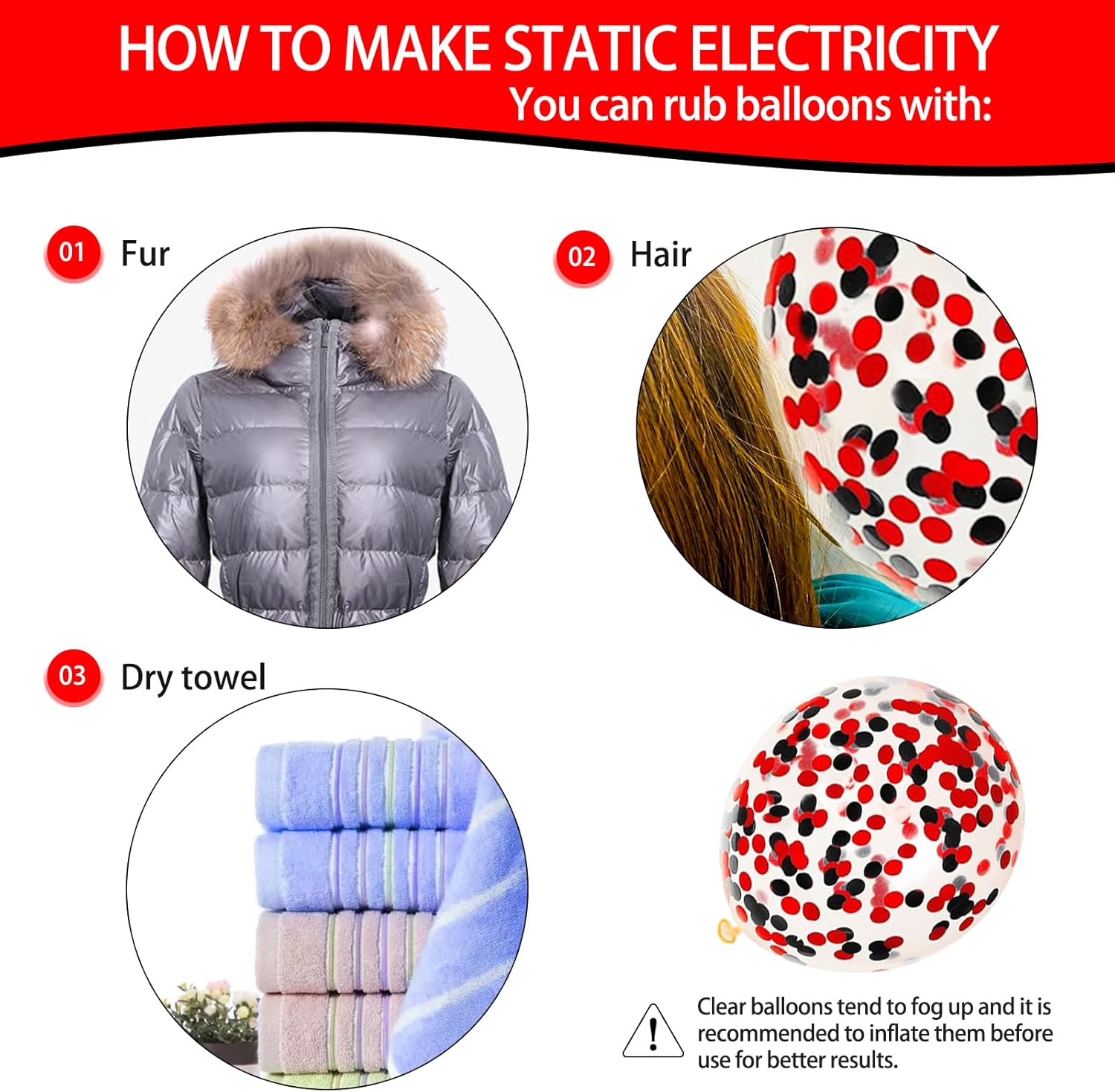 - ăEasy To UseăBlack red white latex balloons and confetti balloons can be filled with air, helium and even water. Please do not over inflate the balloons to avoid bursting. If you have any questions about our balloon set, please contact us at once .