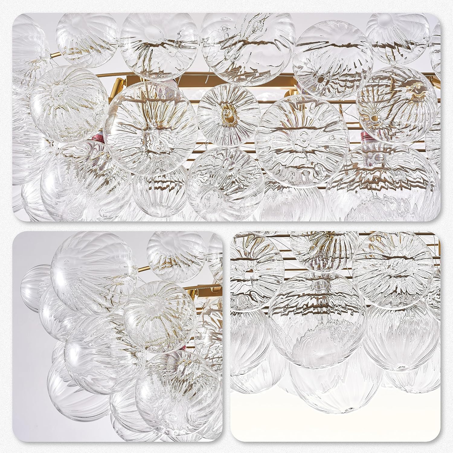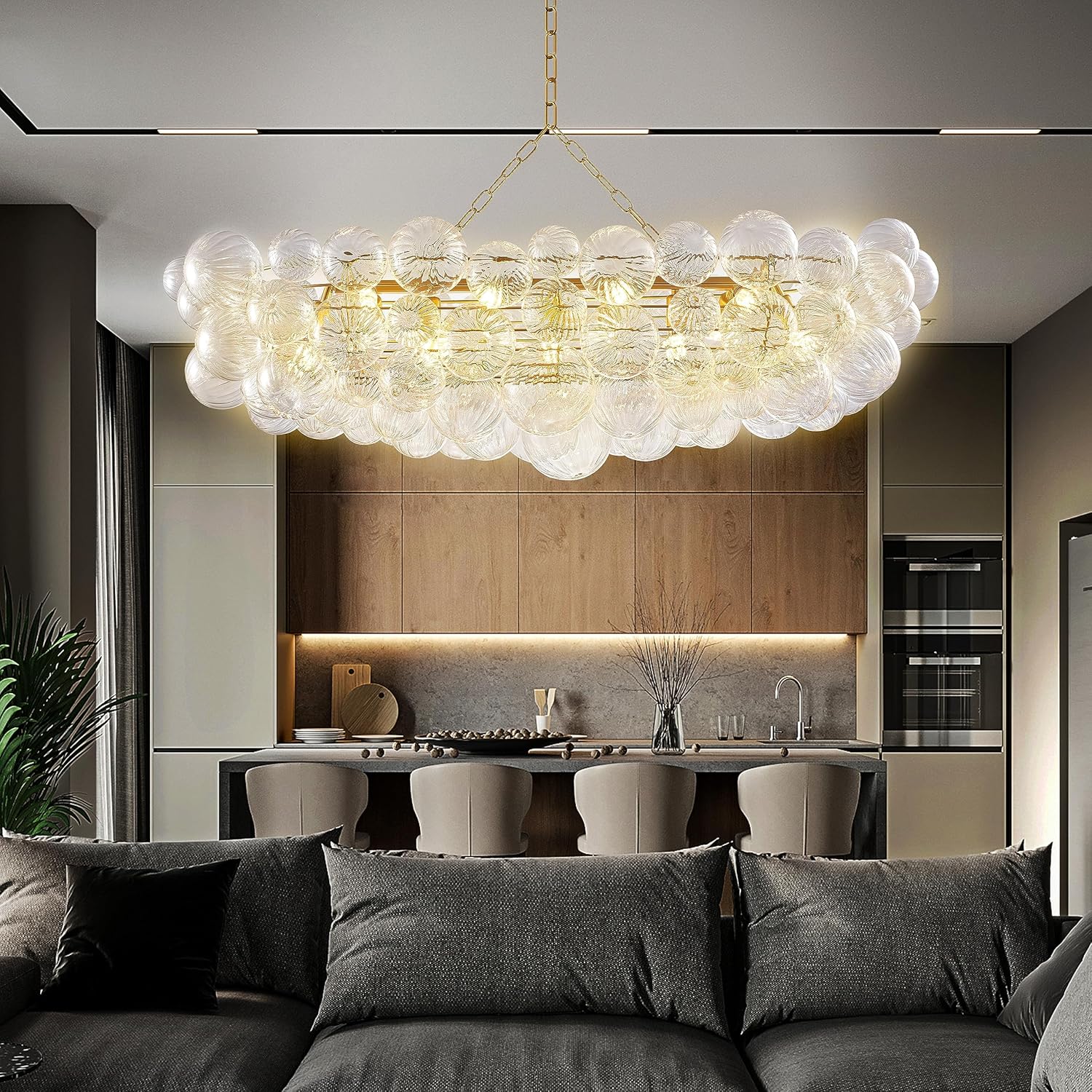 Nordic Bubble Ball Swirled Glass Chandelier 50 inch Rectangular Island Light Fixture Gild Gold and Clear Blown Glass Lighting for Dining Table, Living Room