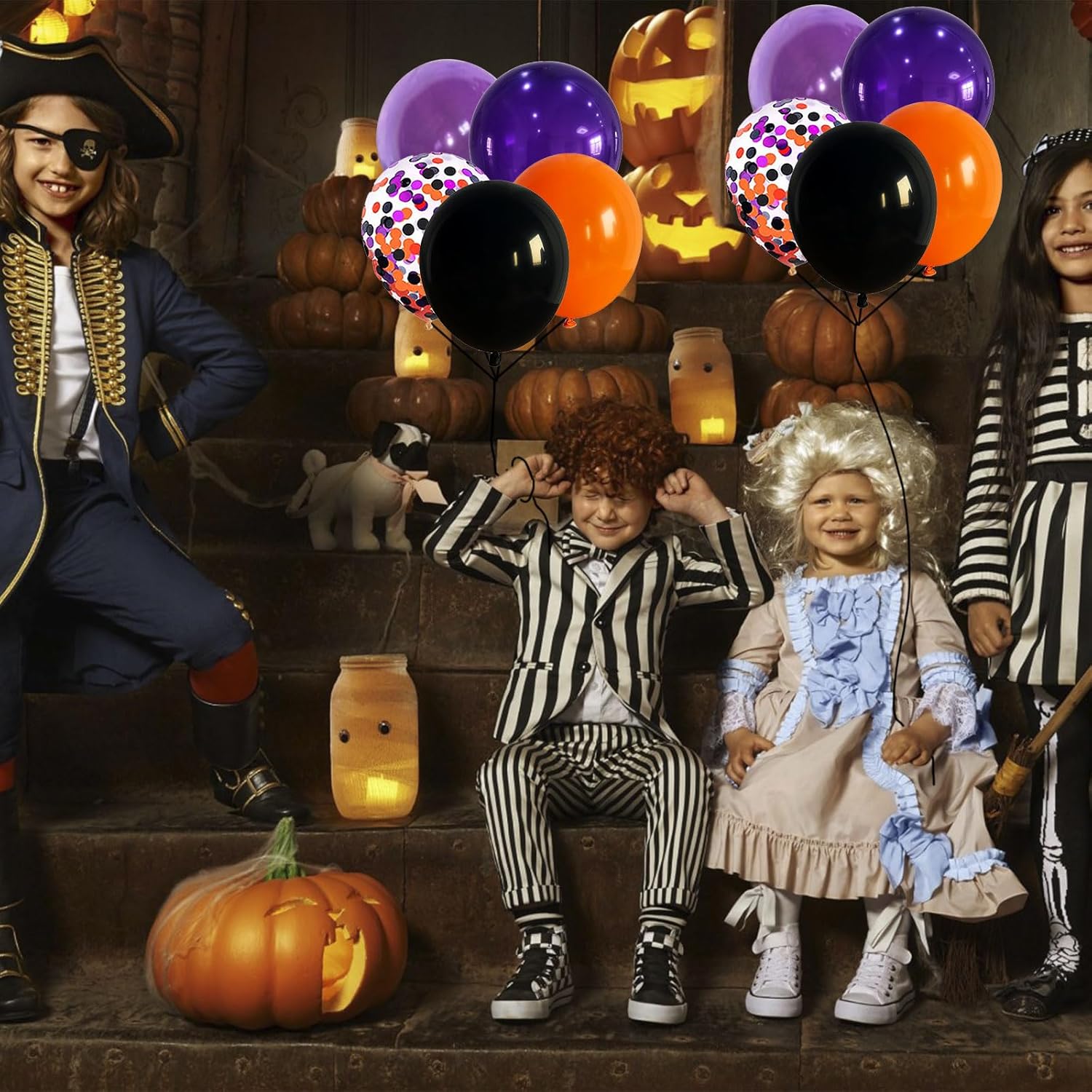 - π Halloween Party Decoration Balloon - 60 Pack Halloween balloon kit: 12Inch 10Pcs Dark Purple Balloons, 12Inch 10Pcs Purple Balloons, 12Inch 15Pcs Black Balloons, 12Inch 15Pcs Orange Balloons, 12Inch 10Pcs Orange Black Purple Confetti Balloons and 1pc balloon ribbon. It's the perfect addition to Halloween party or event, creating an atmosphere of fun that everyone enjoy.