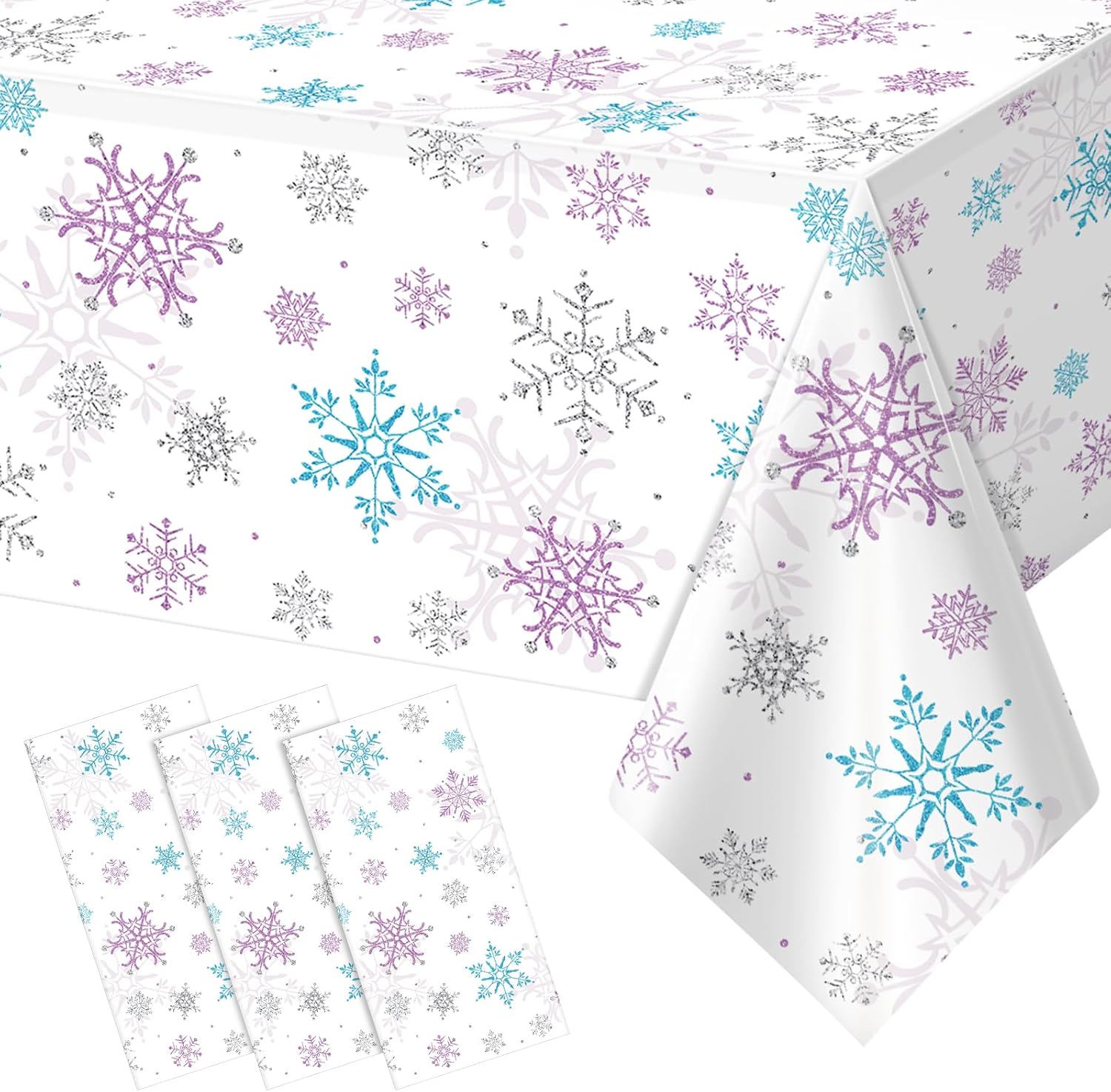 - What will you receive:3 pieces rectangular Christmas party tablecloth,all over printed with purple and blue snowflake patterns on white backdrop,ideal for decorating your winter holiday and Christmas party supplies and decorations