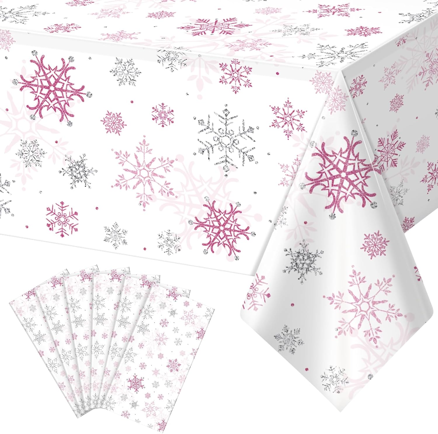 - What will you receive: 6 pieces pink Christmas plastic party tablecloth,all over printed with pink and silver snowflake patterns on white background,ideal for decorating your winter onederland holiday Christmas party supplies and decorations