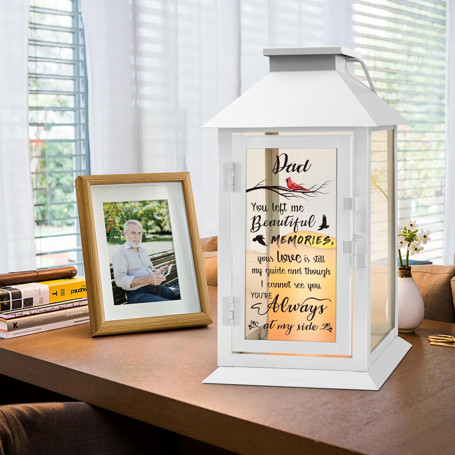 - Sympathy Gifts for Loss of Dad: Memorial lanterns are custom memorial gifts for loss father that offer hope, comfort and help to a grieving friend or family member. Flickering flameless candle lights surround us like those we love never leave. Longer lasting than other gifts like flowers, place sympathy lanterns around home to remind you of happy memories. The cardinal pattern on the glass makes us feel that our loved ones are close by. Father's love is eternal and will always be by your side.