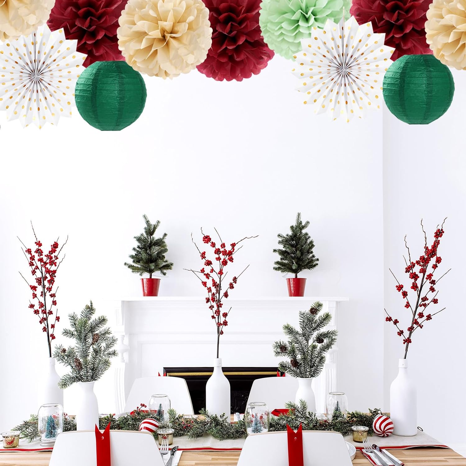 Sage-Olive Green Burgundy-Champagne Boho Party-Decorations - 20pcs Birthday Paper Lanterns Fans,Tissue Pom Poms,Honeycomb Balls,Bunting,Christmas Bridal Baby Shower Wedding Engagement Decor Burgleda