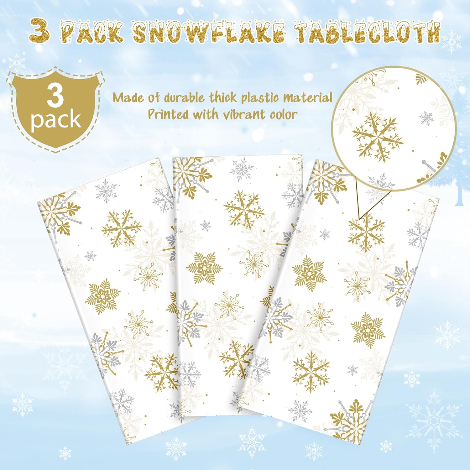 - What will you receive:3 pieces white and gold Christmas plastic party tablecloth,all over printed with gold and silver snowflake patterns on pure white backdrop,ideal for decorating your winter holiday and Christmas party supplies and decorations