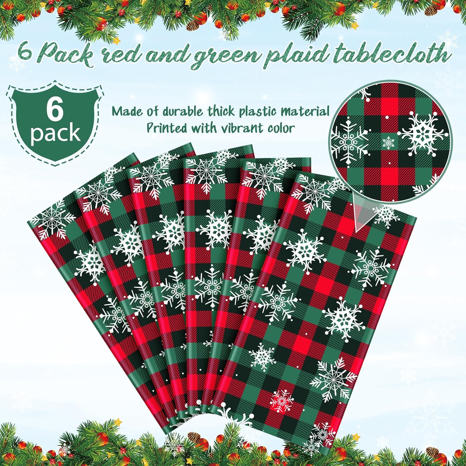 - What will you receive: 6 pieces plastic Christmas party tablecloth,all over printed with white snowflake patterns on red and green buffalo plaid background,ideal for decorating your winter holiday Christmas party supplies and decorations