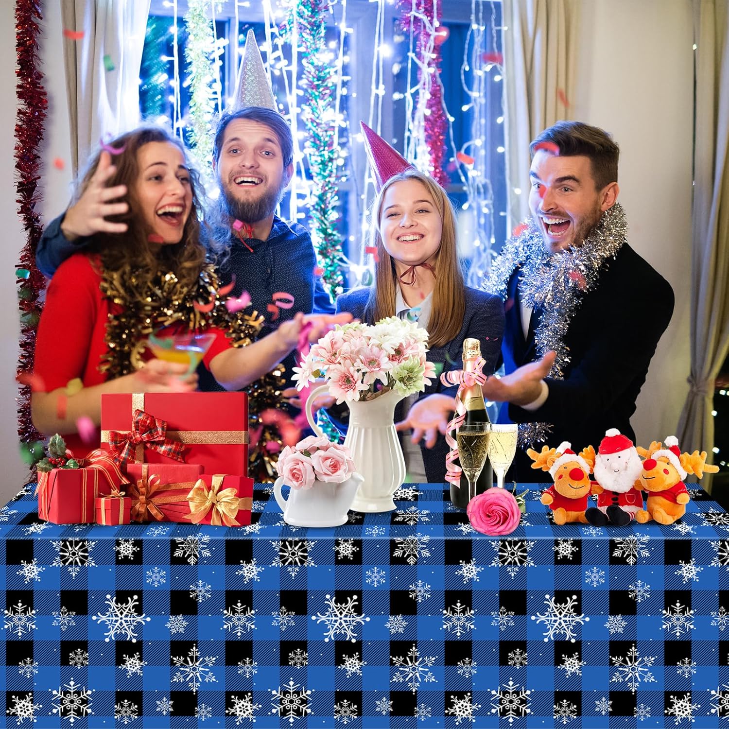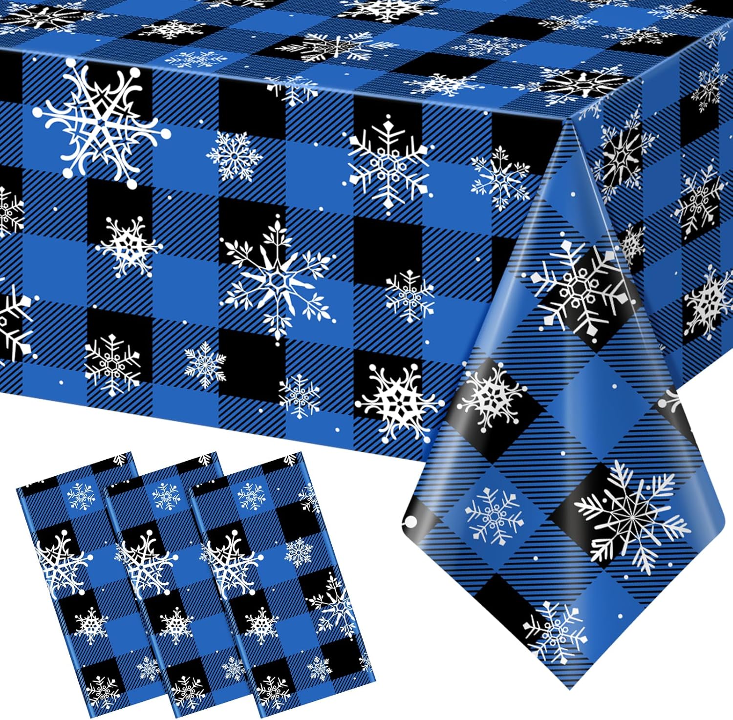 - What will you receive:3 pieces plastic Christmas party tablecloth,all over printed with white snowflake patterns on black and blue buffalo plaid background,ideal for decorating your winter holiday Christmas party supplies and decorations