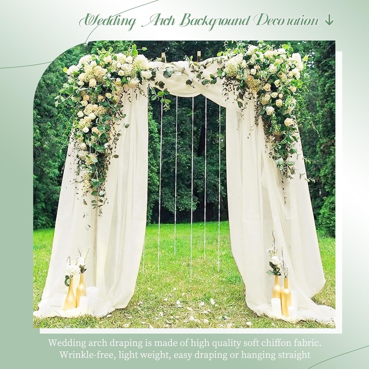 - 👑【Premium Wedding Arch Draping Fabric】This Ivory chiffon drapery backdrop is made of high-quality chiffon material, with a soft and smooth touch without wrinkles. The high-quality workmanship makes all edges sewn beautifully and has good durability. Soft sheer drapes will help to create beautiful folds or leave it flowing loose onto the floor, Create a romantic scene easily.