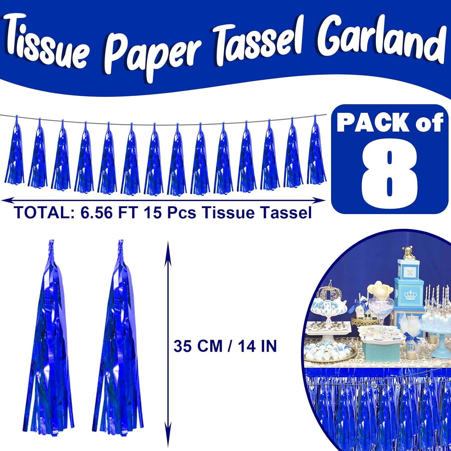 - 【Blue Party Supplies Set】: The total length of the blue birthday tassels banner is 78.7 feet 120tassels, divided into 8 strips, each 9.8 feet long. Each banner contains 15 tassels, and each tassel measures 14 inches, for birthday decorations many occasions, and so on