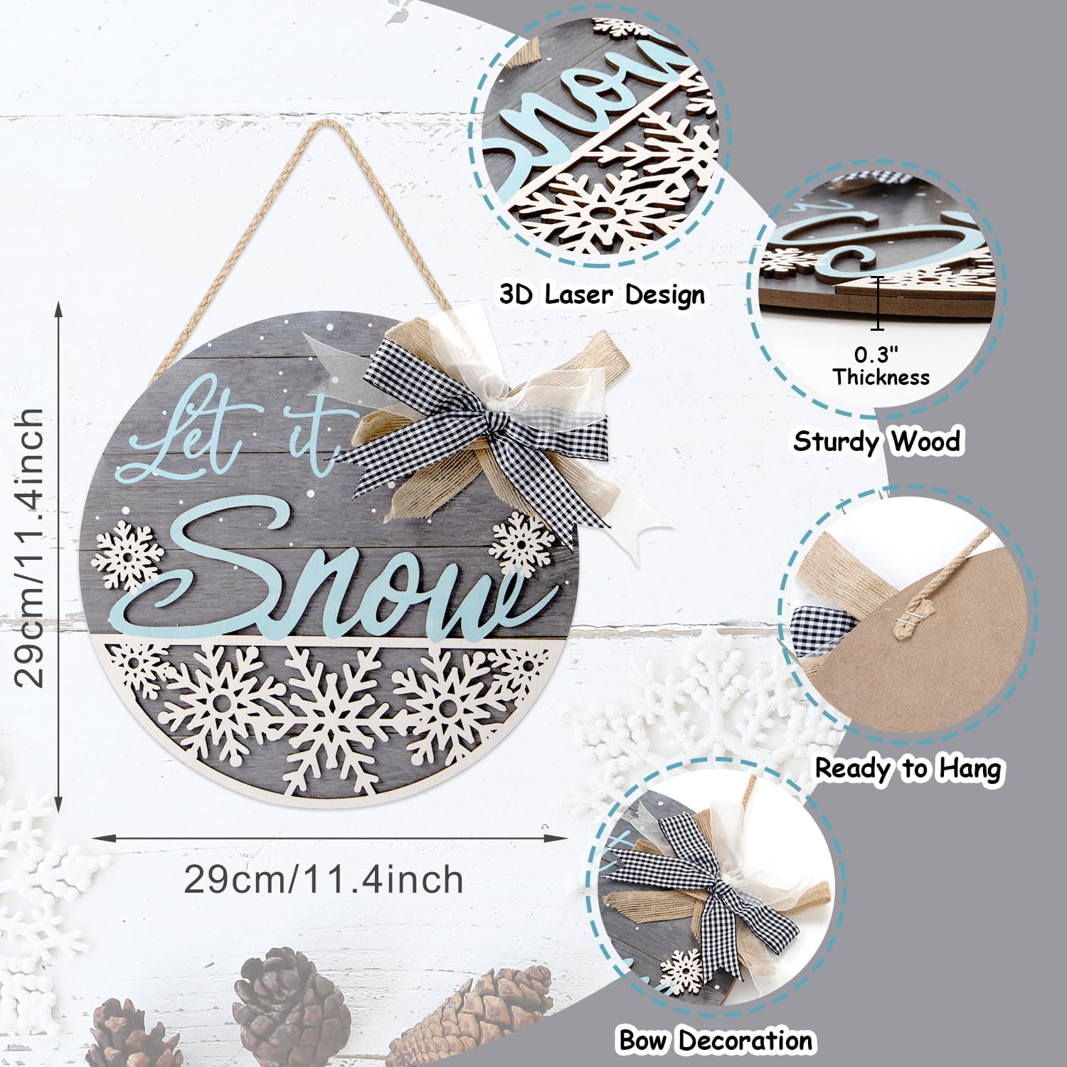 - Winter Decoration with Exquisite 3D Design----Our hello winter door sign is designed with a plaid bow. The word “Let it snow” and snowflakes patterns are all 3D with a thickness of 3mm. Unlike the ordinary wood sign, this has a multi-layered visual effect.