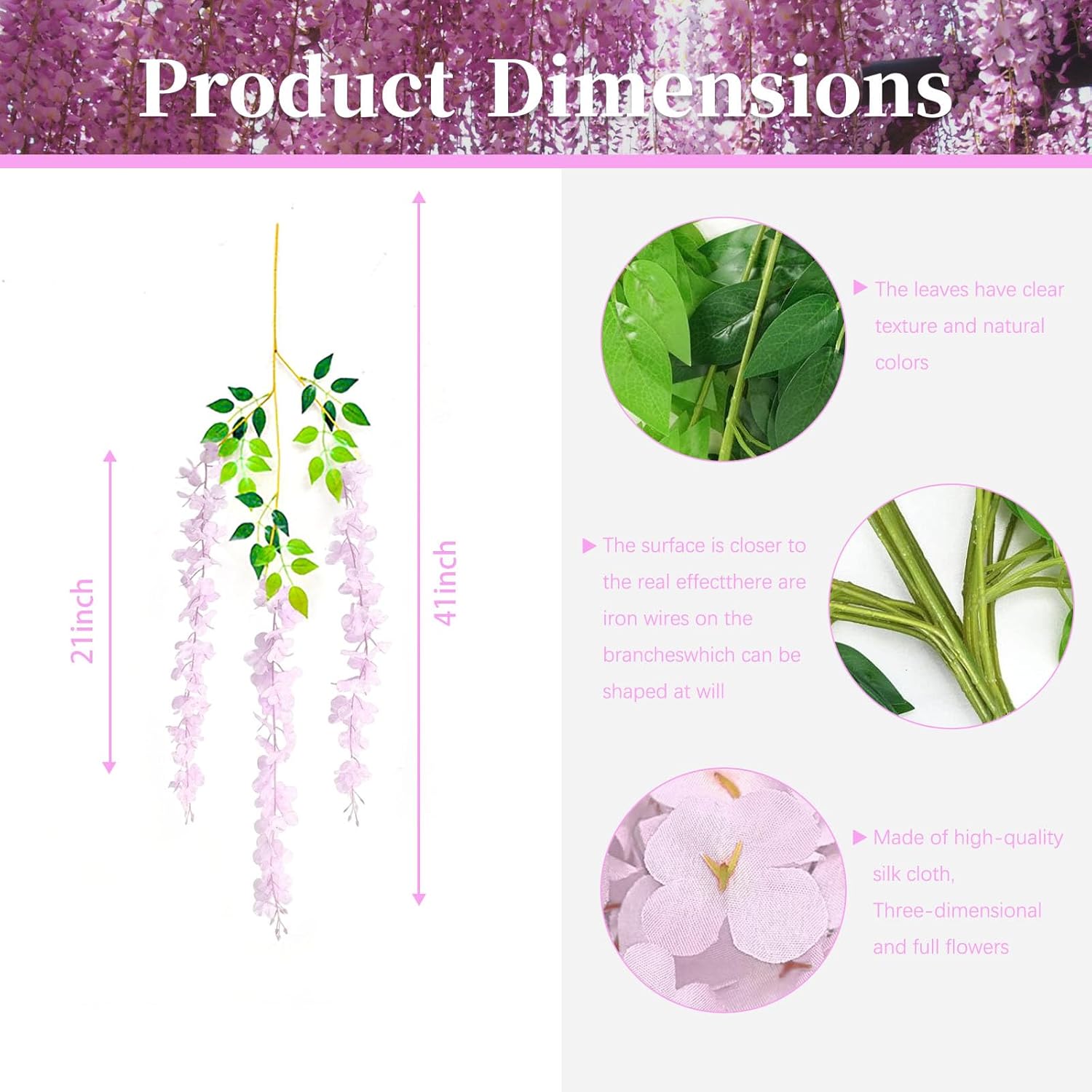 - 【Cycle Used】The pink artificial wisteria garland is made of silk, the stem is made of metal wire and plastic, and it can be easily bent and recovered, so you can use it many times, very environmentally and cost-effective.