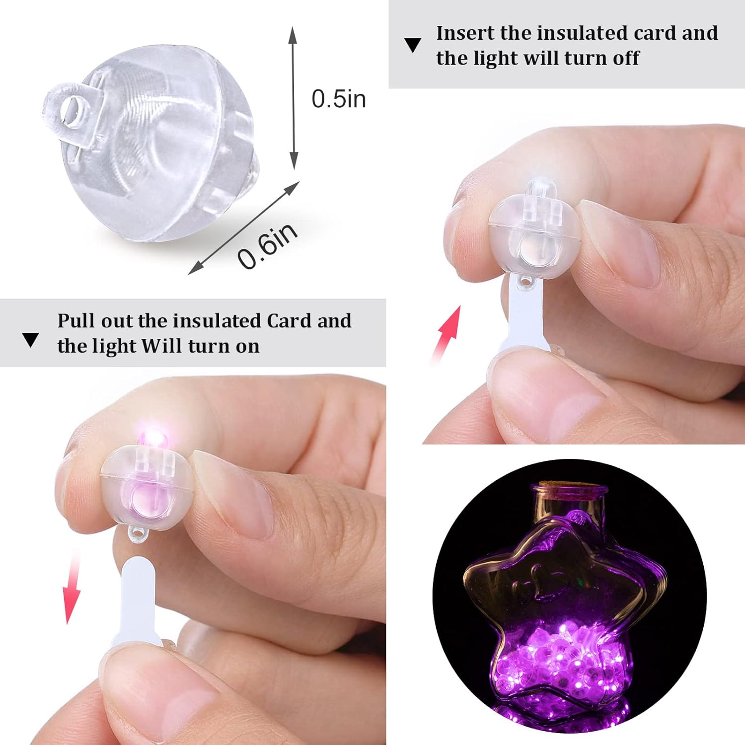 - Easy Operation - These lights are easy to use, just pull out the Insulation film before putting them into the balloons, paper lanterns, vases, bottles or any centerpieces you would like