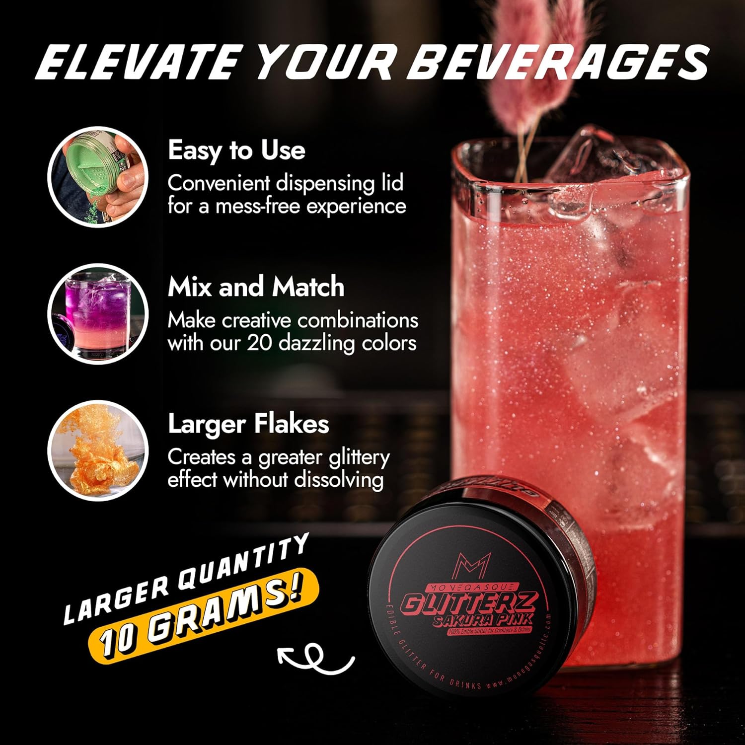 - PREMIUM EDIBLE GLITTER FOR COCKTAILS – Add a touch of glamour to your creations with MONÉGASQUE Glitterz. Perfect for cocktails, cakes, and more, our halloween glitter is flavorless and safe, crafted from mica-based pearlescent and food-grade colorants.
