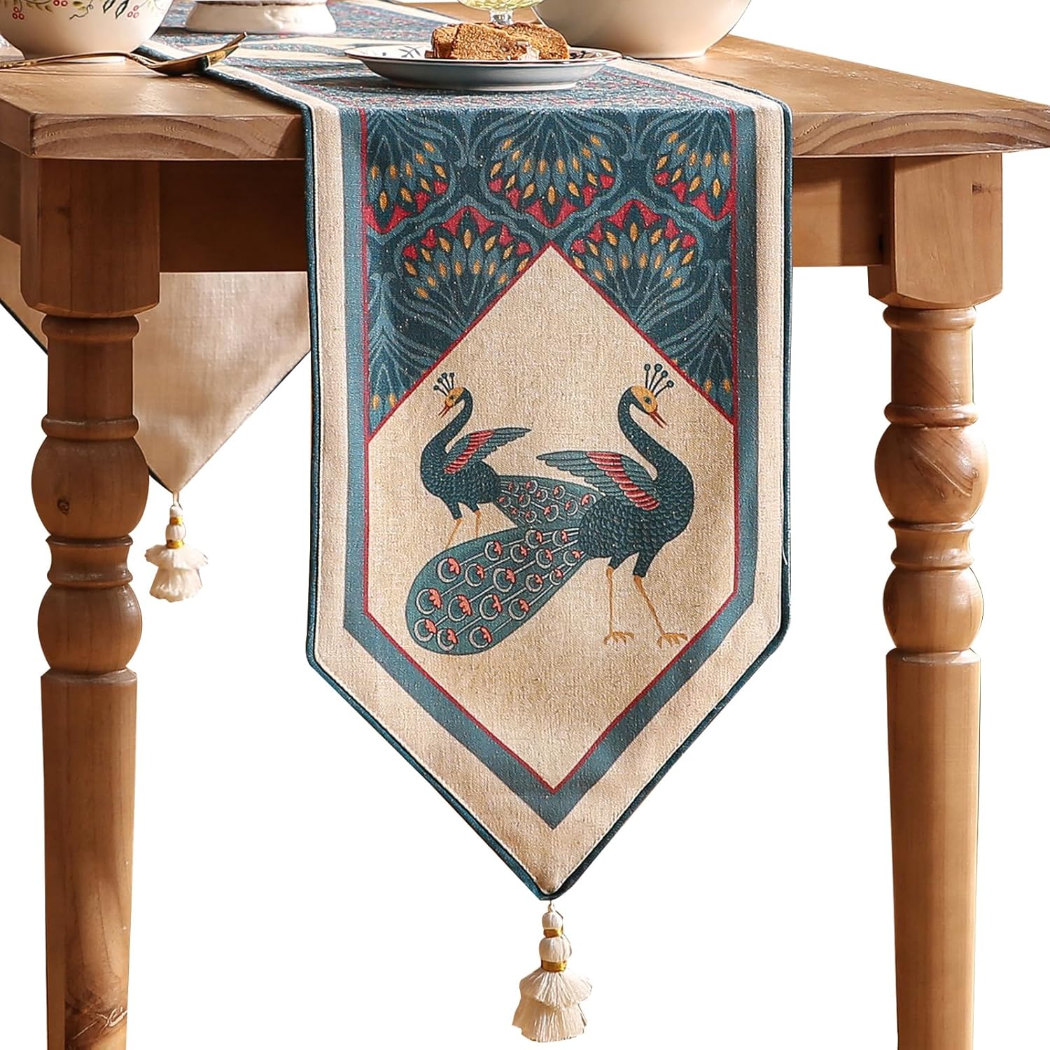 - Unique Design: The main pattern of this table runner matching features peacock feathers in a combination of peacock blue and flaxen colors. The dark outer part and light inner part inject a vivid retro and exquisite visual experience into the table setting.