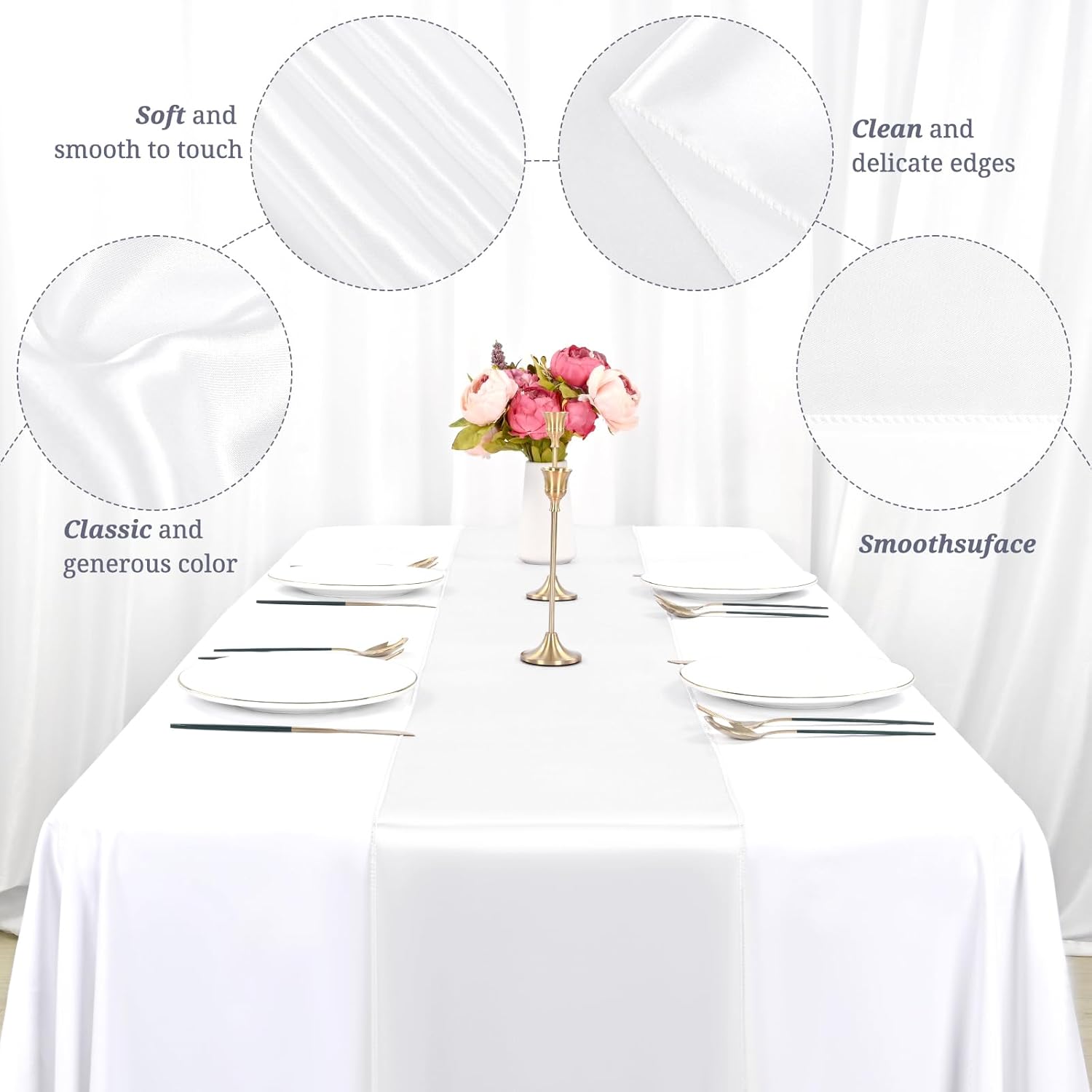 - 🍷【Easy to Flat】Seamless one-piece design and all sides overlocked with clean look.The satin table runner is in rigorous style that has a smooth surface without wrinkles and flat and delicate sides.Satin table runner also has a natural sense of drooping style, not easy to fade, not shrink thus reusable.The hign quality satin table runner can also be tied to be adorable bowknot as chair cover decorations, same color table and chair decorations makes your events more fantasy and impressive.