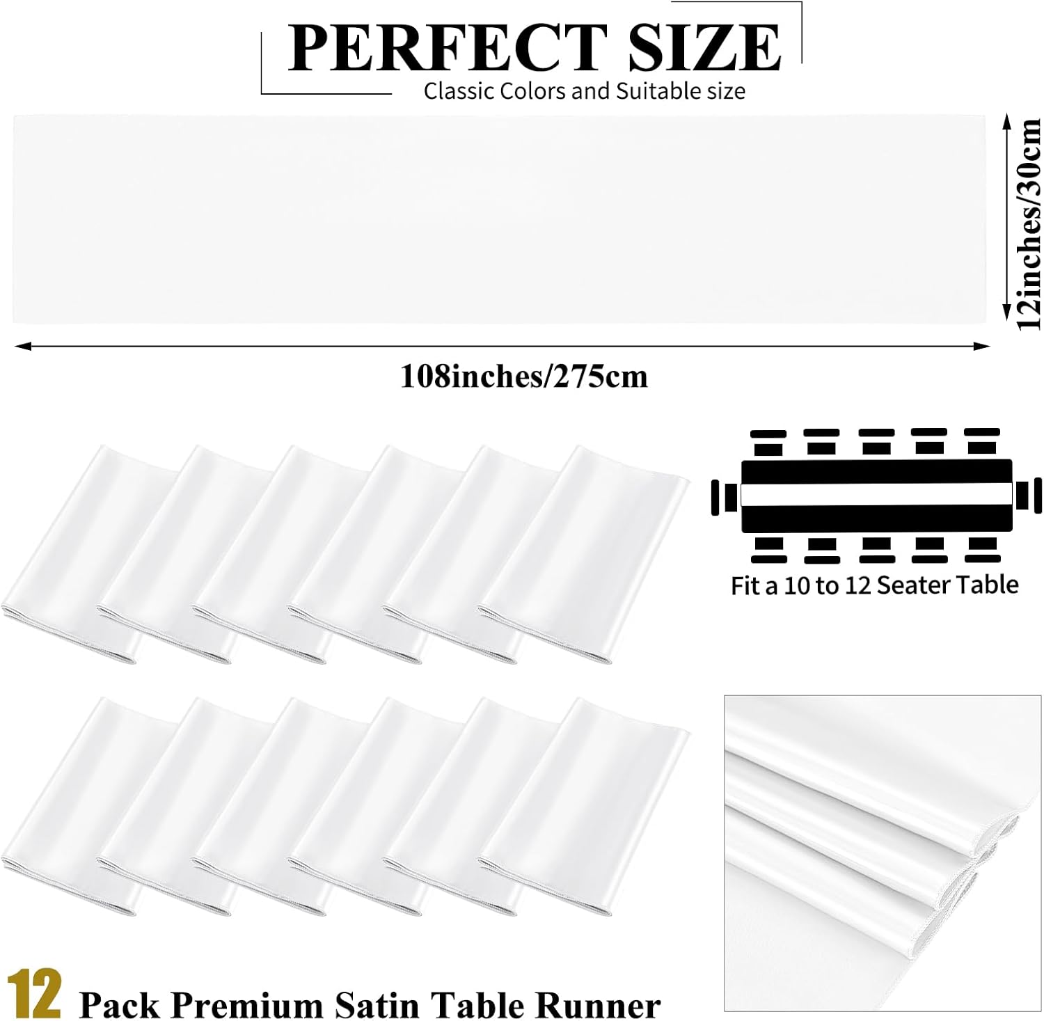 - 🍷【Set includes】12 Pack white satin table runner measures 12" x 108" in size, appropriate for a table that can seat 8-10 people. This satin table runner can fit a 6ft/8ft rectangular table or round table well.This satin table runner is great for event table decorations.Our satin table runner make your dining table more dazzling and outstanding.Purchase our 12piece satin table runner and save even more.