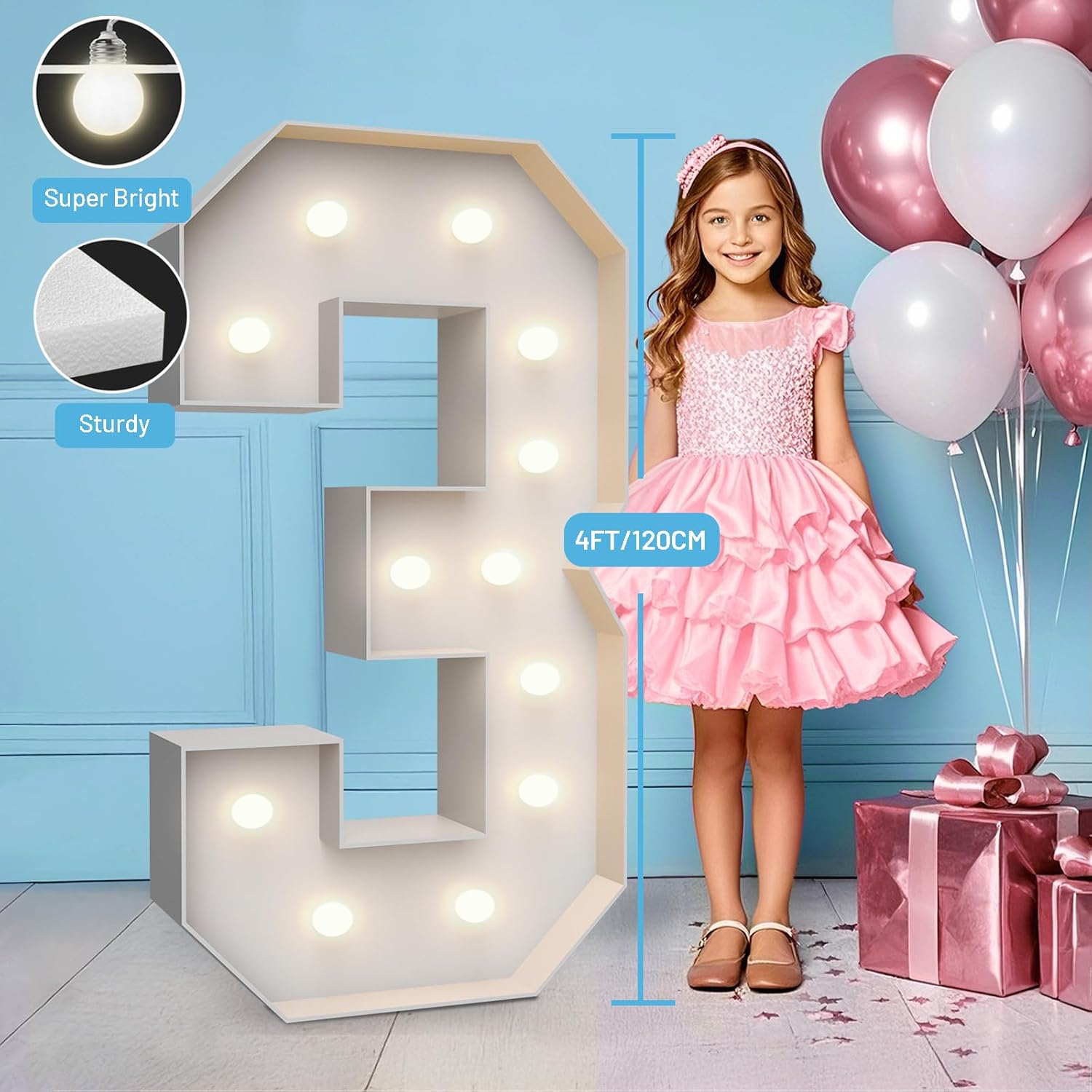 4FT Marquee Light Up Numbers 3,Party Decoration Large Marquee Light Up Letters with Weighted Water Bag,Pre-cut Foam Board Set Can Be Used for Birthdays,Weddings,Baby Anniversaries