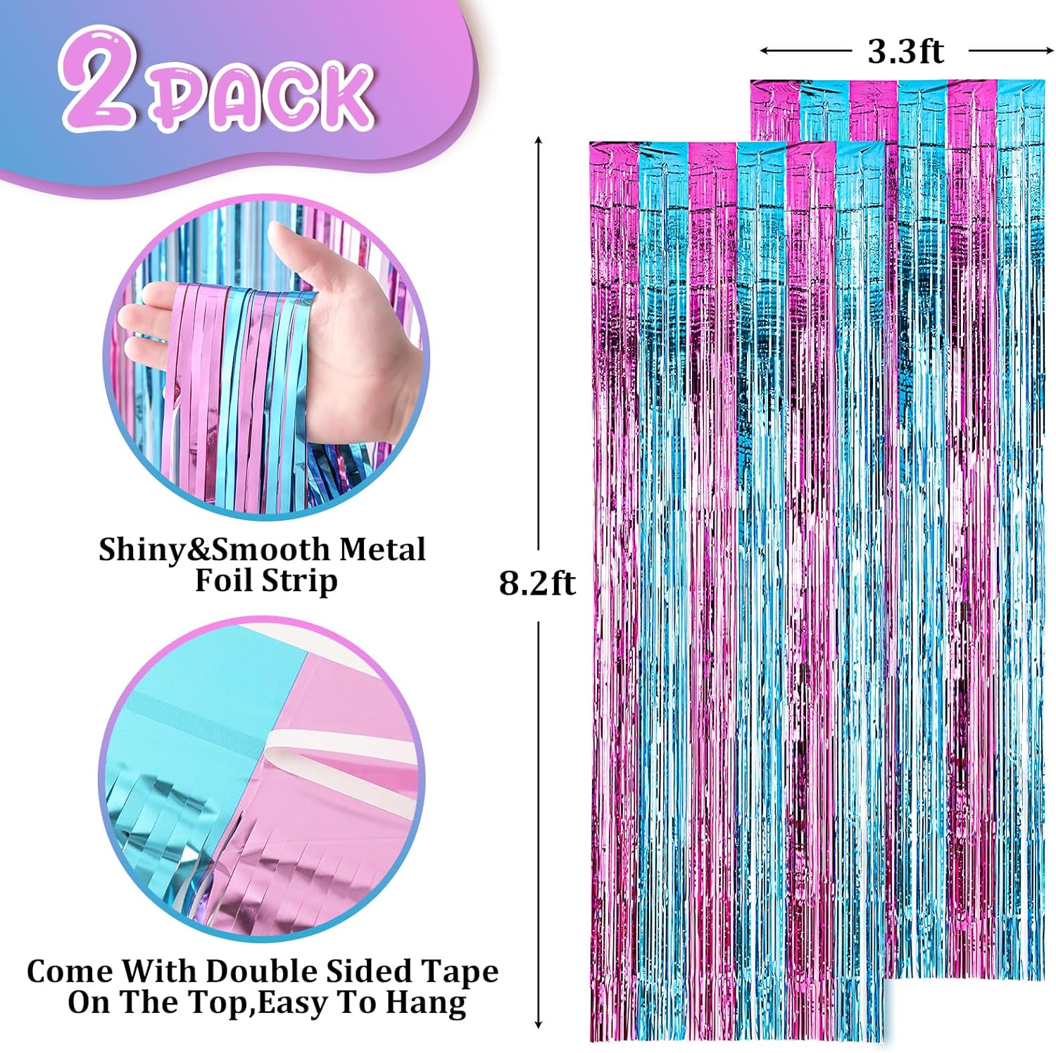 - Premium Material: This Blue and Pink foil curtain backdrop is made of stable tinsel, non-fading, stay shiny and reusable. Unfold it and then enjoy your glittering party
