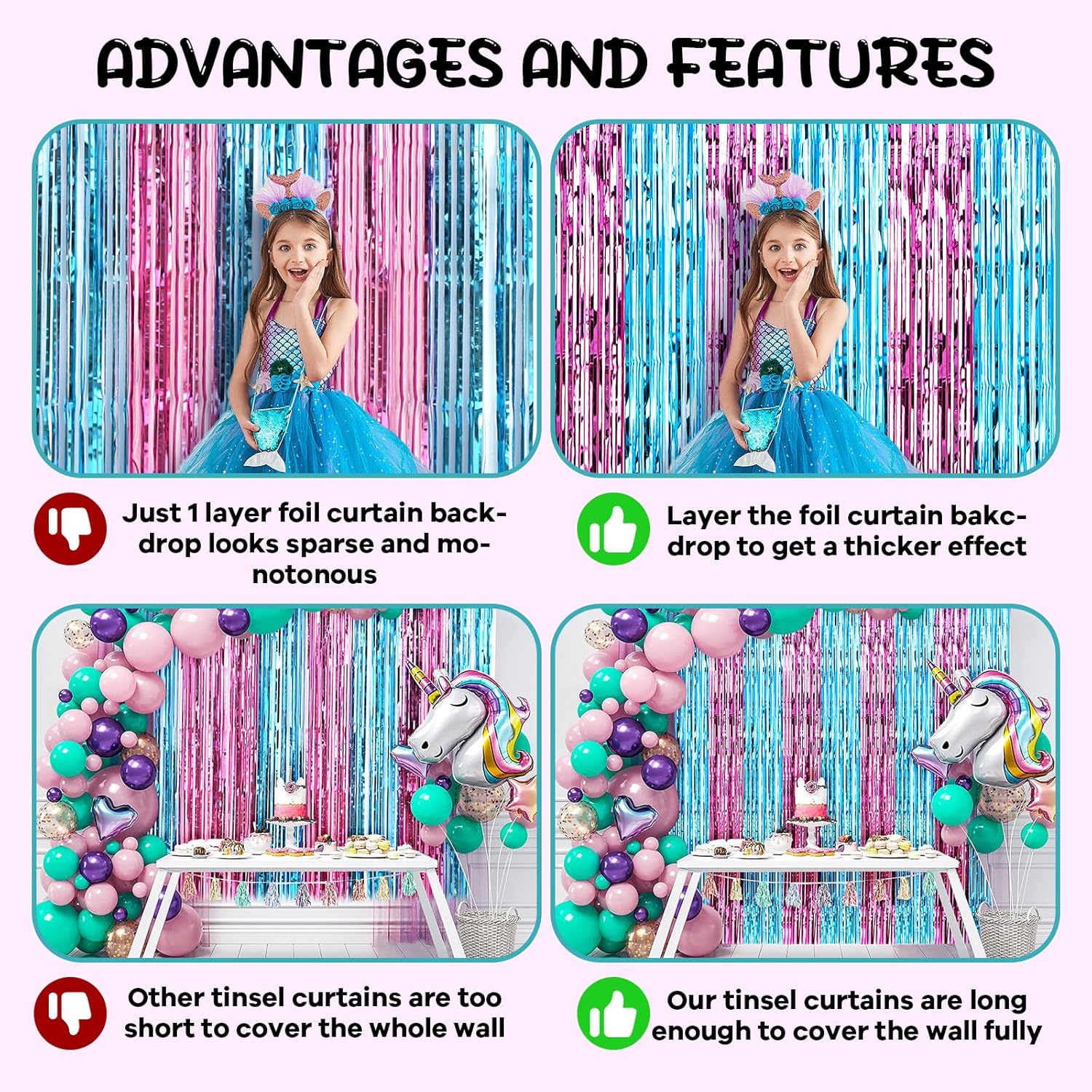 - Eye-Catching Design: These tinsel backdrops boast vibrant colors and a shimmering effect that reflects light beautifully. Your friends will be mesmerized by the captivating atmosphere these curtains create