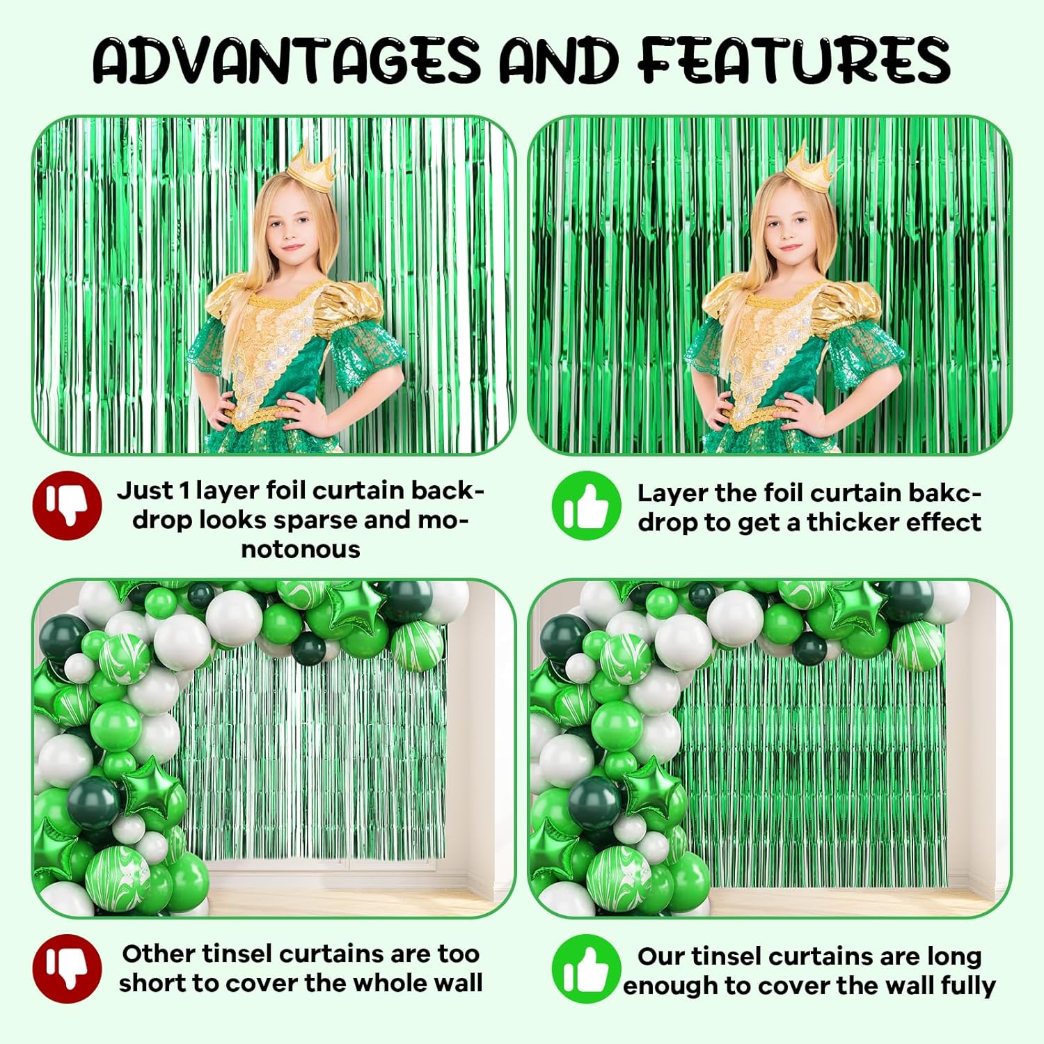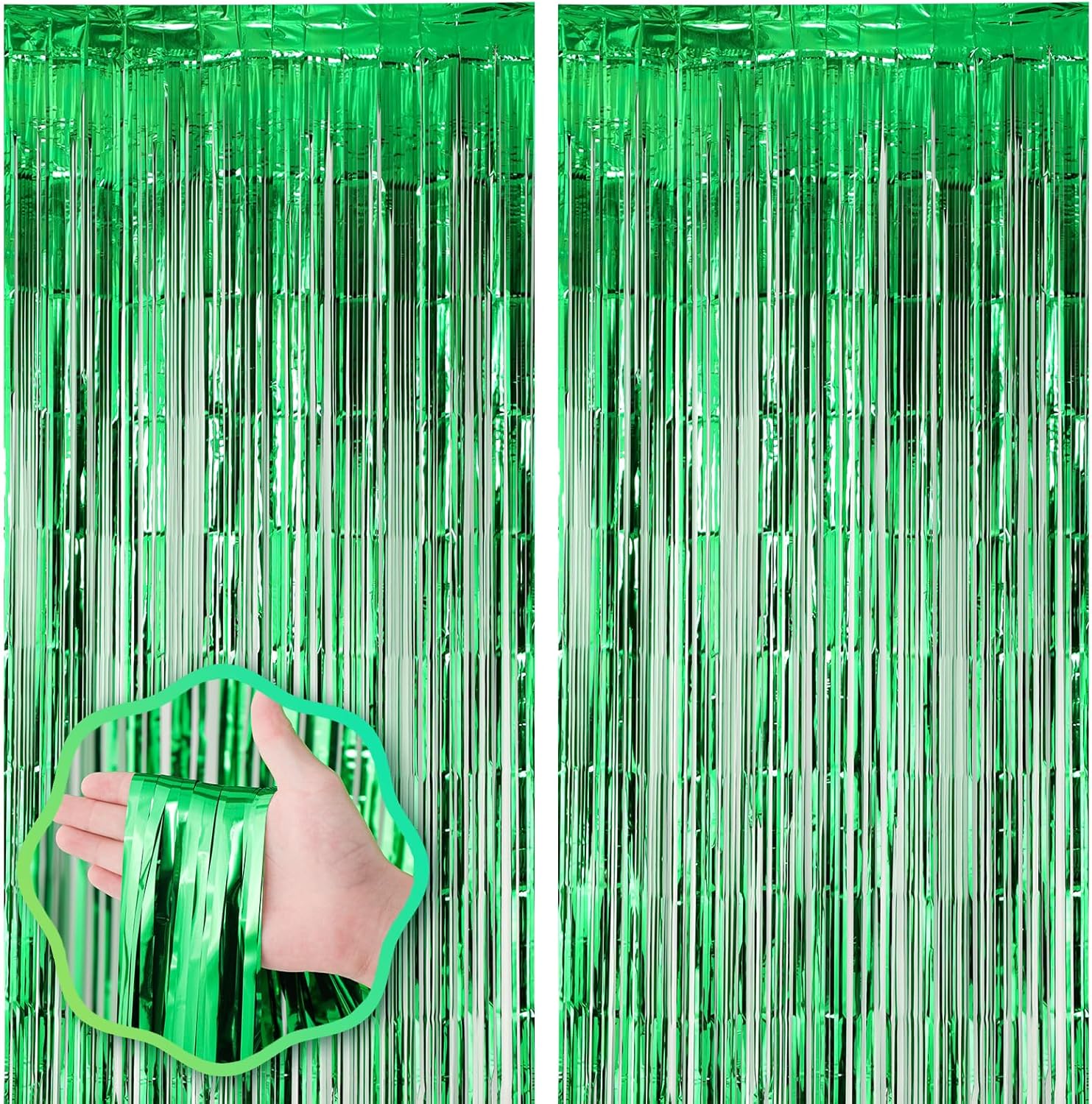 • Premium Material: This green foil curtain backdrop is made of stable tinsel, non-fading, stay shiny and reusable. Unfold it and then enjoy your glittering party