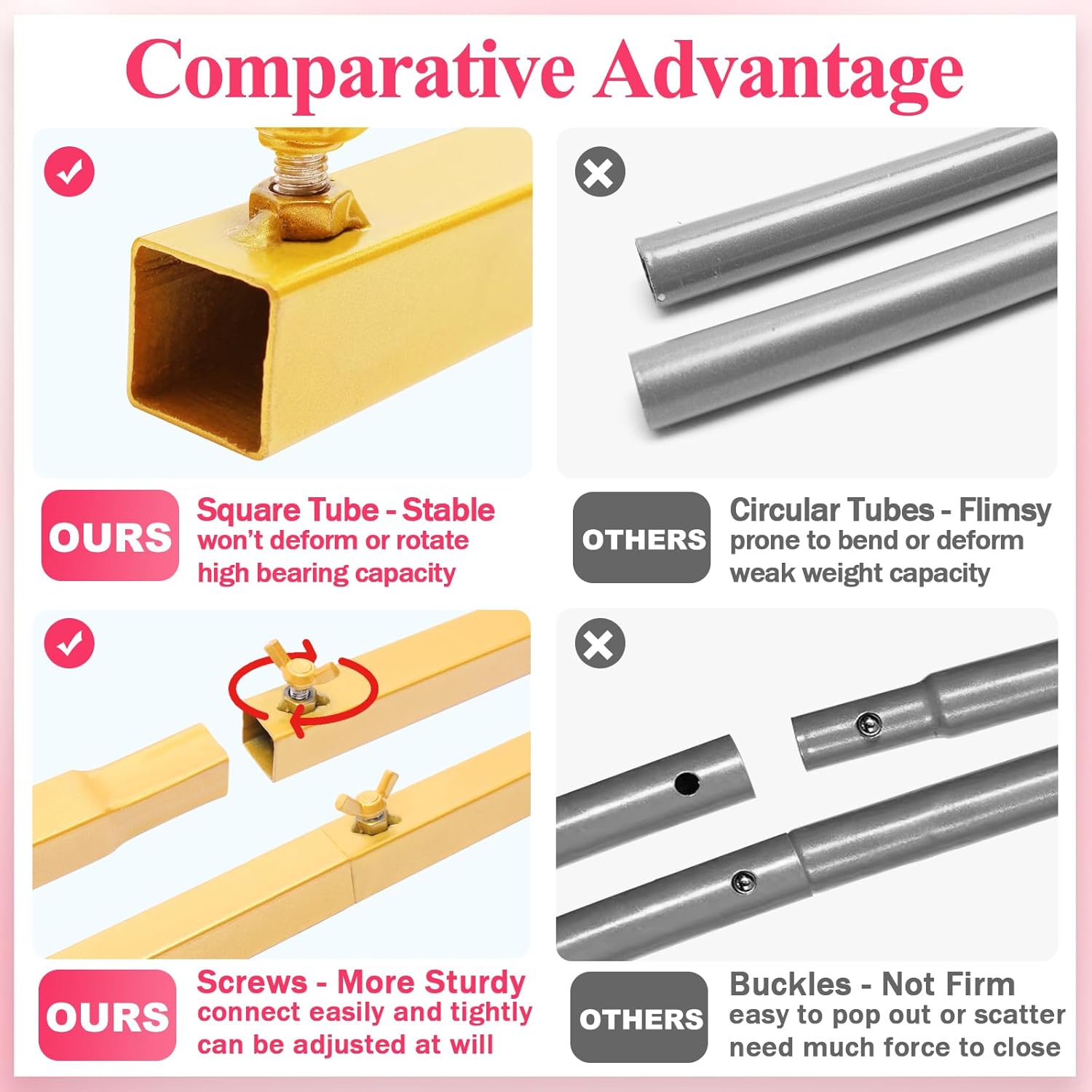 - 【Stable Base】Metal arch backdrop stand with a cross bar on the base making the metal gold wedding arch more stable. Adding some decorative elements to the base can also increase stability. Decorate square wedding arch with flowers, greenery, garlands, tulle swags or vines to make your event stand out.