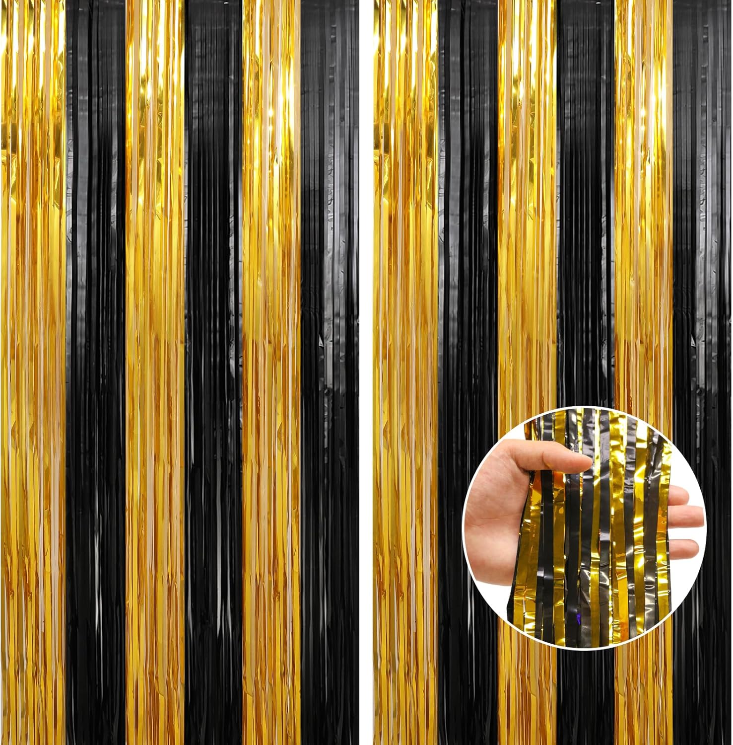 Crosize 2 Pack 3.3 x 9.9 ft Gold and Black Foil Fringe Curtains Party Decorations, Gold Tinsel Curtain Backdrop for Parties, Door Streamers, Glitter Streamer Fringe Backdrop for Birthday Decoration