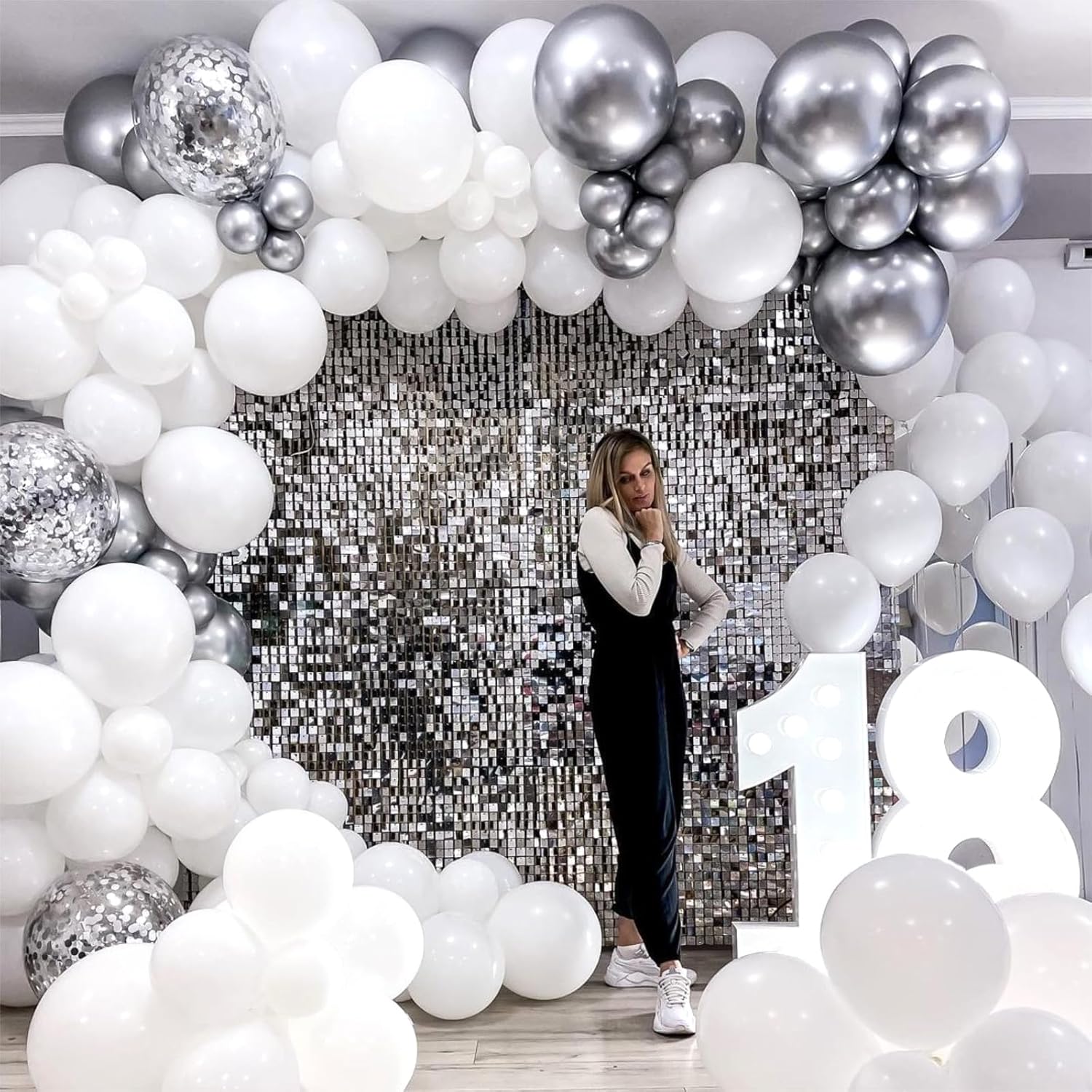 - π Silver White Balloons - You will get 35 pieces 12 inch latex party balloons set, includes white 15pcs, metallic silver 10pcs, silver confetti 10pcs, come with 1pc silver balloon ribbon. Perfect for women men birthday baby bridal shower wedding new year party decorations supplies.