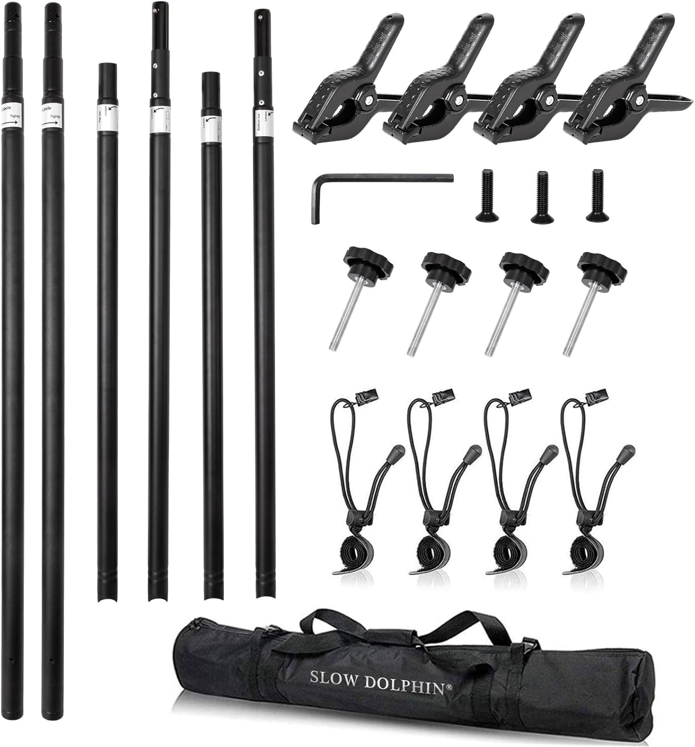 - The kit Package Include: (2) x Heavy Duty Base (2) x 10ft Adjustable Vertical Tube(2) x 5ft Top Crossbar (2) x 5ft Bottom Crossbar (4) x Long Screws(3) x Short Screws (1) x Hex Key Wrench (4) x Photo Spring Clamp/ (4) x Background Multifunctional Clips Holder (2) x wing nut (1) x Carry Bag.