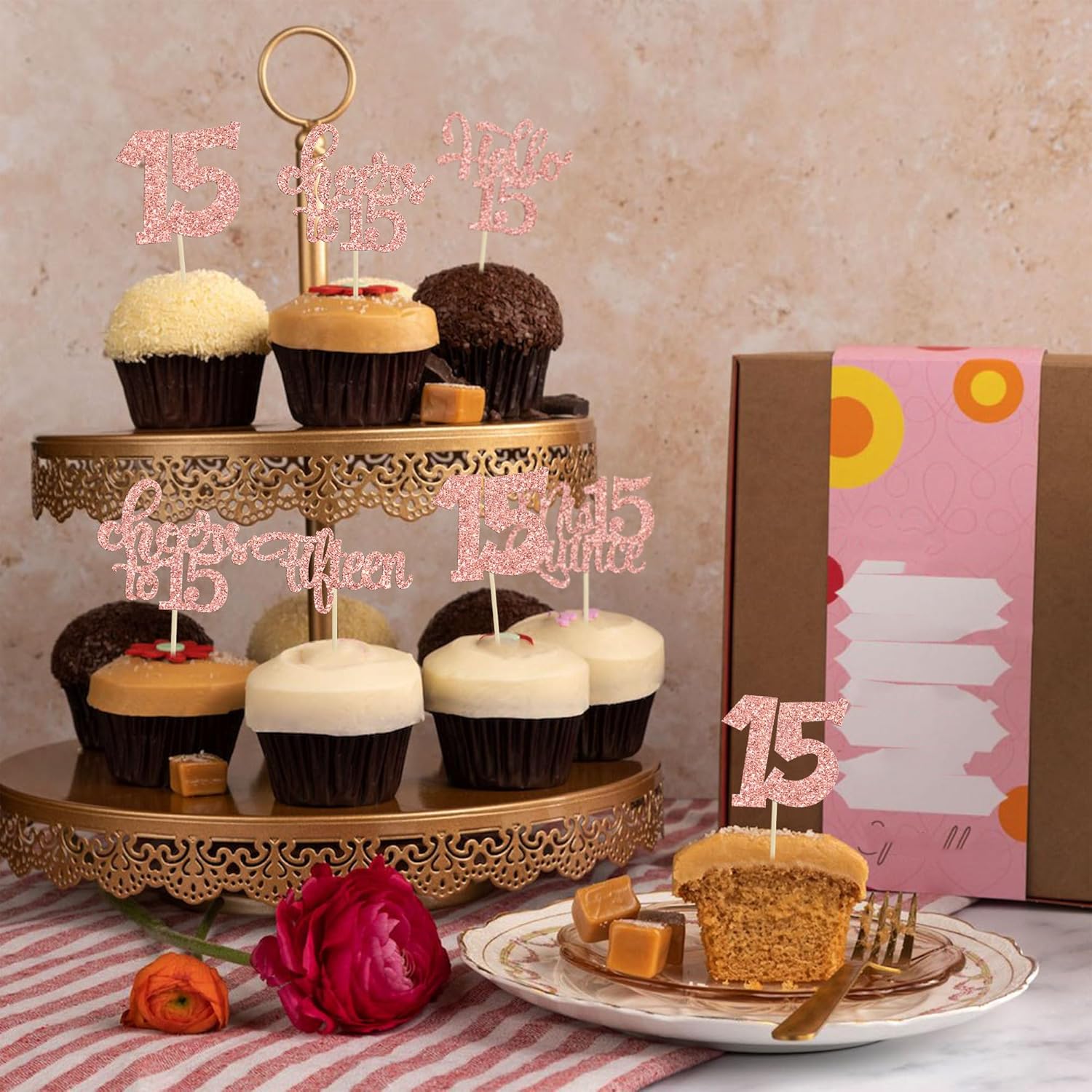 30Pcs 15th Birthday Cupcake Toppers Fifteen Cupcake Picks Cheers to 15 Years Old Mis Quince 15 Cake Decorations for 15th Birthday Anniversary Party Rose Gold Glitter
