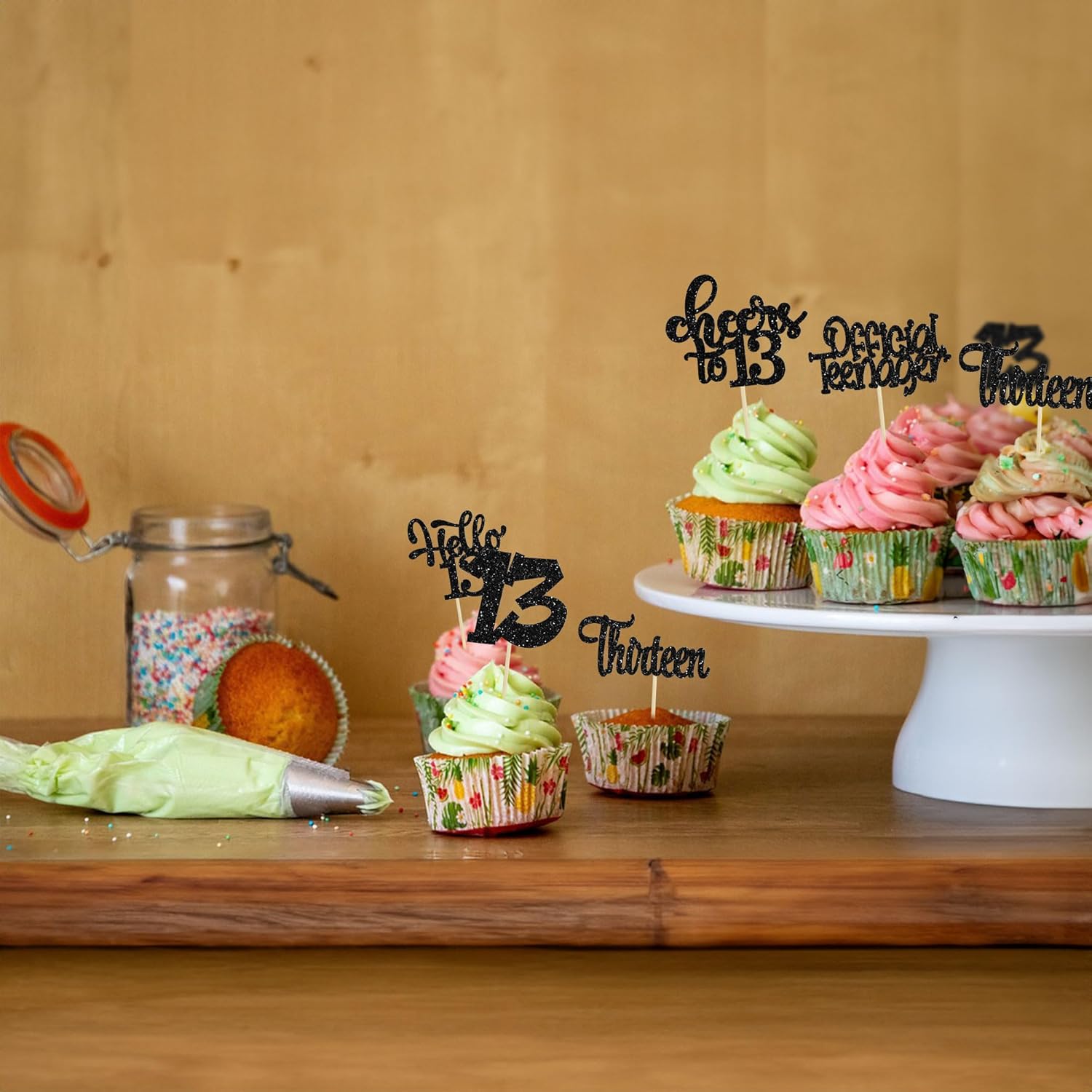 30Pcs 13th Birthday Cupcake Toppers Hello 13 Cupcake Picks Official Teenager Cheers to 13 Years Old Cake Decorations for 13th Birthday Anniversary Party Supplies Black Glitter