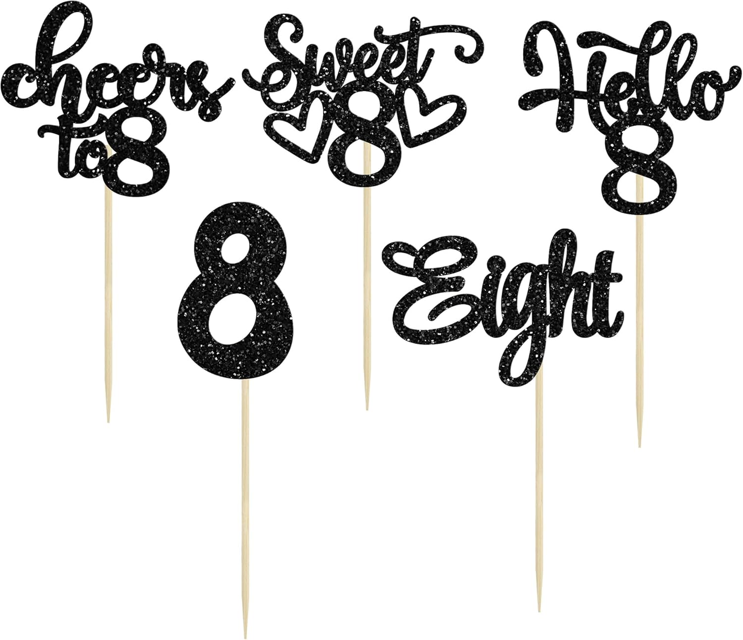 30Pcs 8th Birthday Cupcake Toppers Glitter Eight Hello 8 Cupcake Picks Cheers to 8 Years Old Cake Decorations for 8th Birthday Party Supplies Black