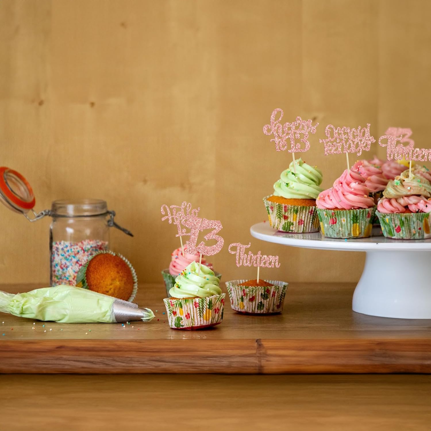 30Pcs 13th Birthday Cupcake Toppers Hello 13 Cupcake Picks Official Teenager Cheers to 13 Years Old Cake Decorations for 13th Birthday Anniversary Party Supplies Rose Gold Glitter