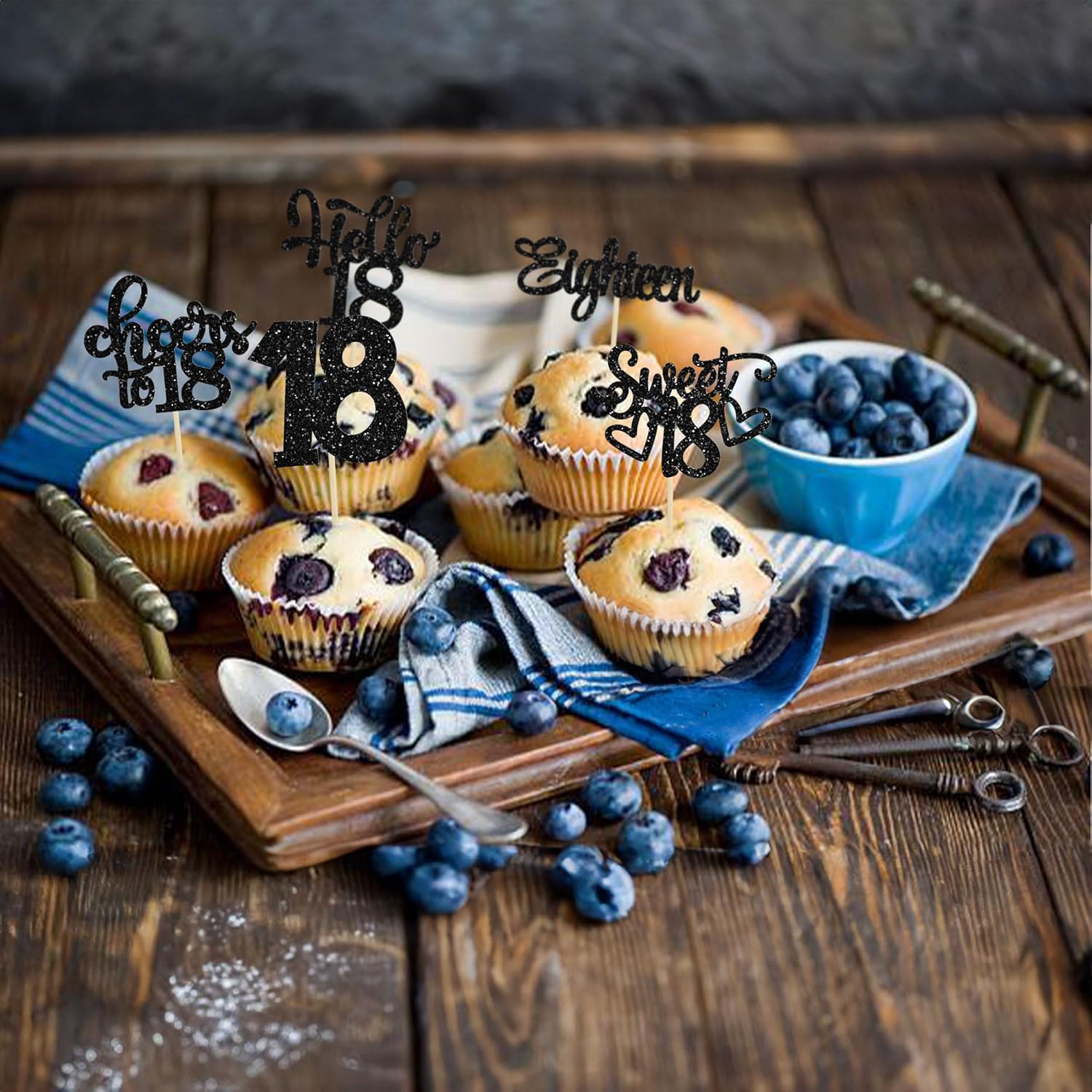30Pcs18th Birthday Cupcake Toppers Eighteen Happy 18th Cupcake Picks Sweet 18 Cheers to 18 Cake Decorations for 18th Birthday Anniversary Party Supplies Black Glitter