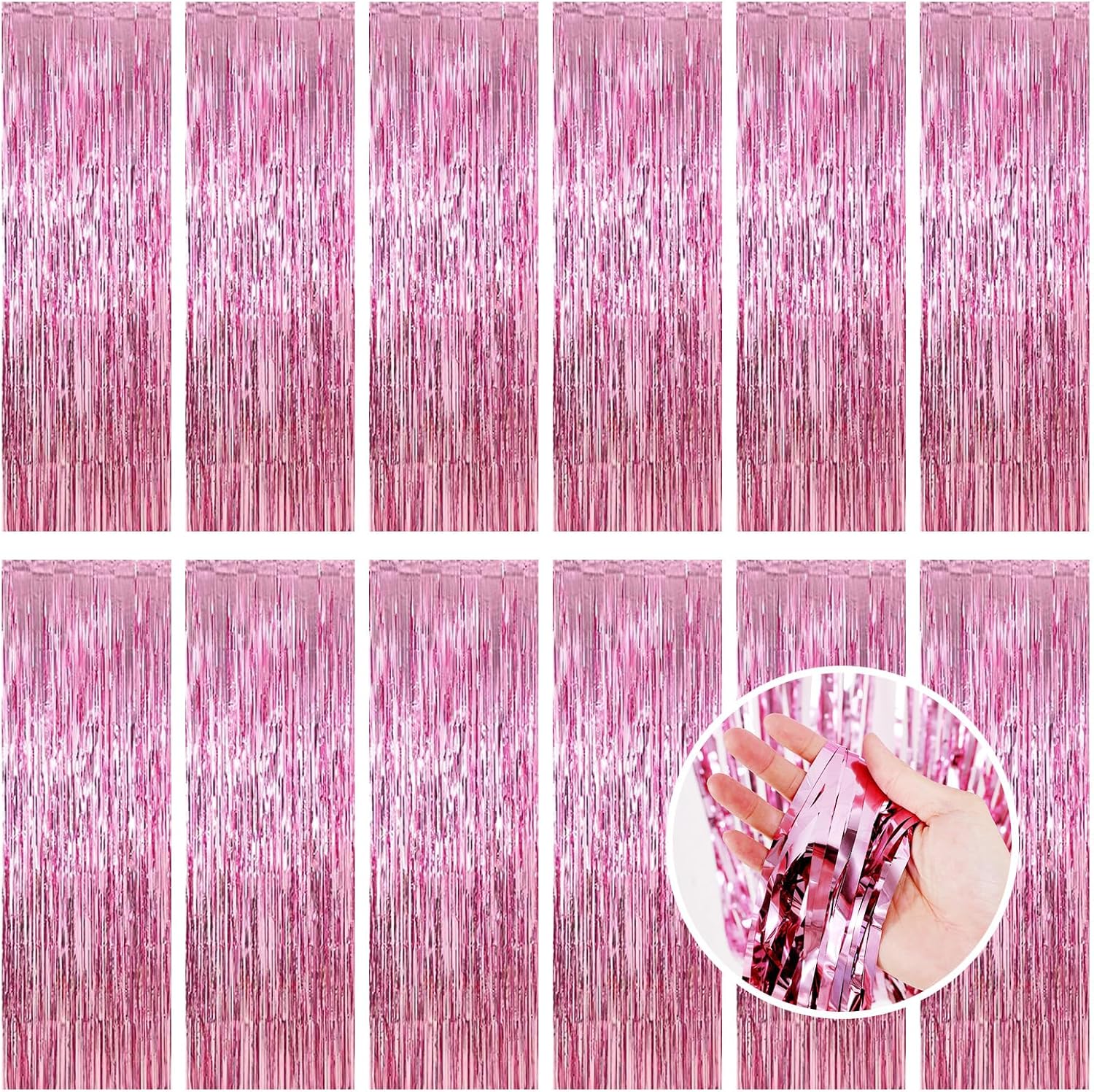Pink Fringe Curtain Party Streamers, 12 Pack 3.3ft x 8.2ft Foil Curtain Backdrop Tinsel Foil Fringe Curtains Photo Booth Backdrop Streamer for Birthday, Wedding, Baby Shower, Disco Party