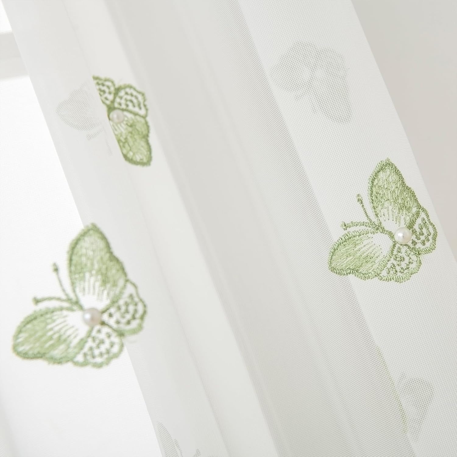 VISIONTEX White Sheer Voile Curtains, Decorative Green Embossed Butterflies Rod Pocket Window Drapes for Home Kitchen, Living Room and Bedroom 54 x 84 Inch, Set of 2 Curtain Panels
