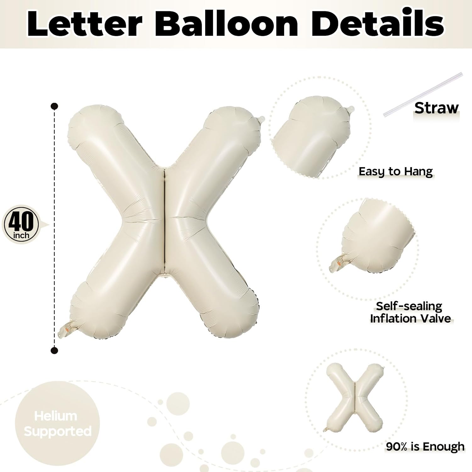 - π What You Get: Our product package includes 1pcs 40 inch "X" letter foil cream white balloon and 1pcs convenient straw for inflate. You can choose any big letter balloons to combine and customize the word you want to form. Make your party more unique and meaningful.