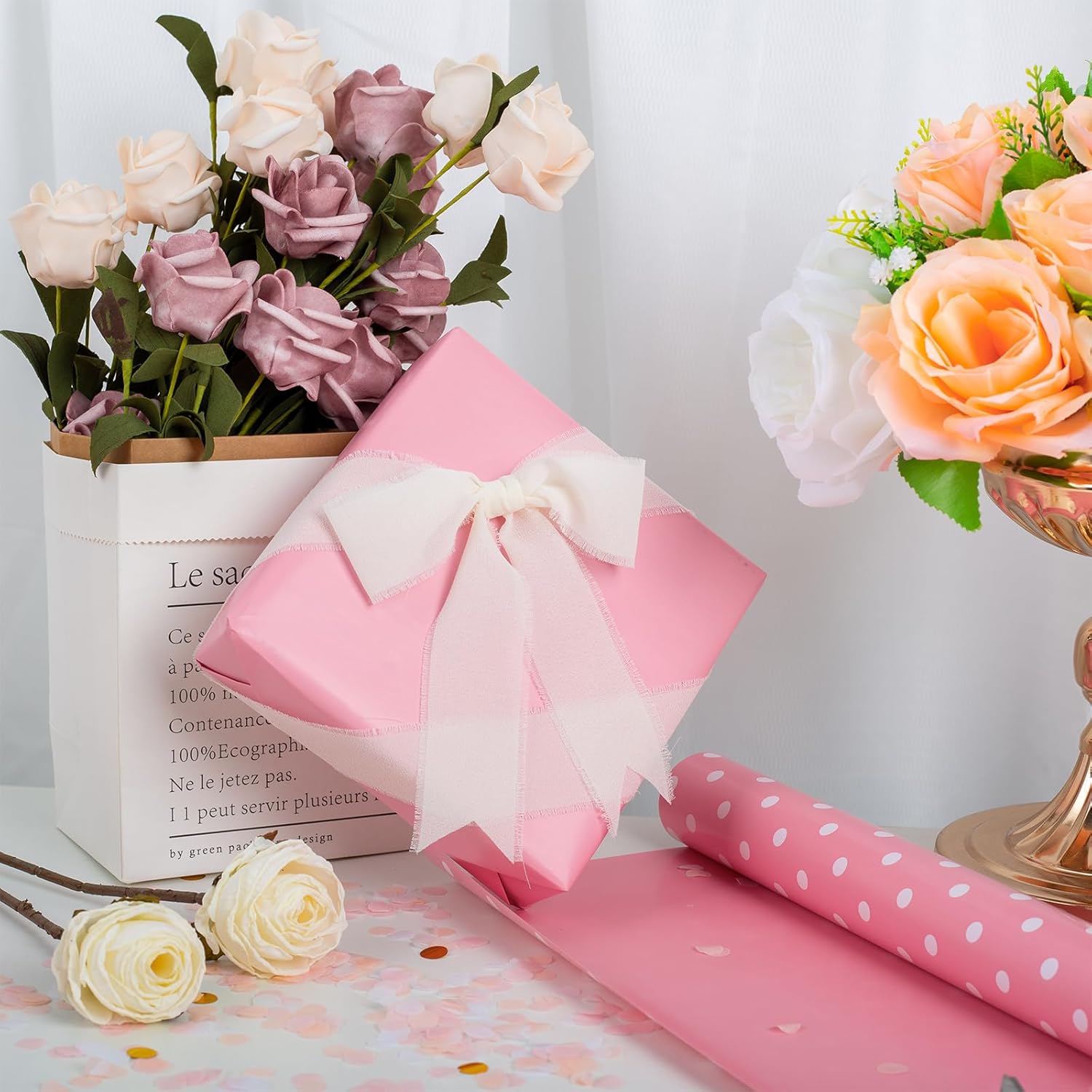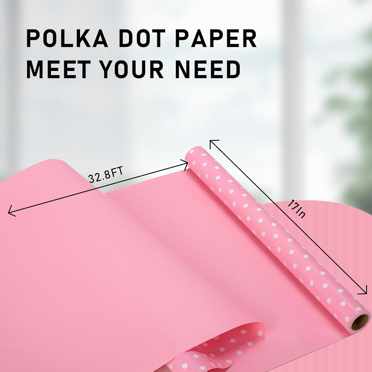 Flyhill Pink Wrapping Paper Roll,Reversible Gift Wrap Paper with Polka Dot Design for Girls,Birthday,Wedding,Baby Shower,All Holidays(17 Inch X 32.8 Feet)